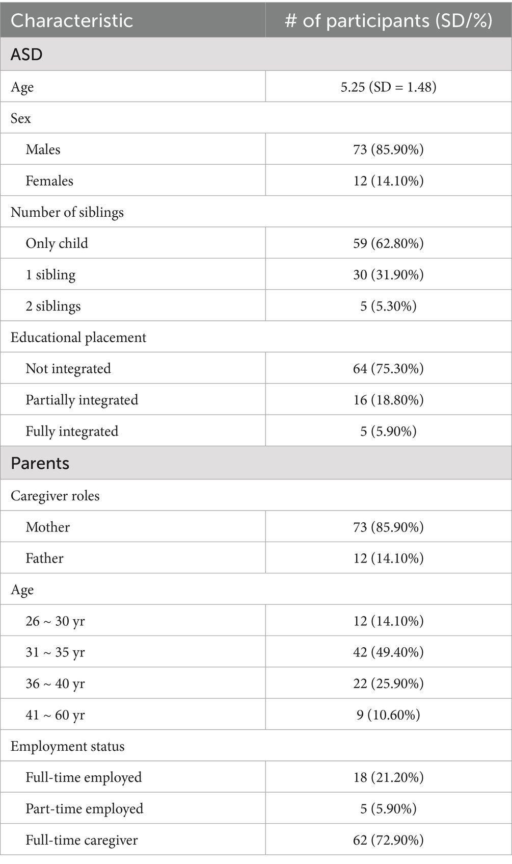 This study specifically focused on preschool-aged children with ASD and their parents, as this developmental stage represents a critical period for early intervention and family adaptation. A total of 94 parent–child dyads were recruited from two autism rehabilitation institutions in central China. The inclusion criteria were as follows: (1) Children must have a confirmed clinical diagnosis of ASD. The Chinese version of the Autism Diagnostic Interview-Revised (ADI-R), adapted from Berument et al. (1999), was used for assessment. For children aged 4 years and older, a cut-off score of 15 on the Social Communication Questionnaire (SCQ) within the ADI-R indicated susceptibility to ASD. For children aged 2–4 years, a cut-off score of 11 was applied due to lower test sensitivity in this age range (Wiggins et al., 2007). (2) Children were required to be between 3 and 6 years of age. This preschool age range was deliberately chosen because it represents a key stage for structured rehabilitation and family-based support, and because the collaborating rehabilitation centers primarily serve children within this age bracket, making the sampling decision both theoretically and practically justified. (3) The child’s father or mother had to serve as the primary caregiver. The final sample included 85 parent–child dyads; participants’ demographics are shown in Table 1.
