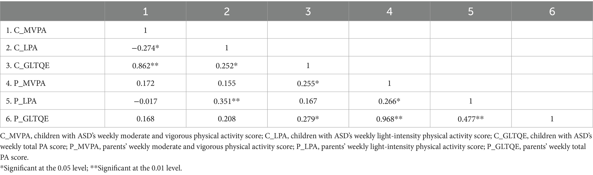 Partial Pearson correlation analyses were conducted to examine associations between different levels of PA in children with ASD and their parents (see Table 1). The results revealed a moderate positive correlation between LPA scores in children and those in their parents (r = 0.351, p < 0.01). Additionally, a weak positive correlation was observed between children’s total GLTEQ scores and their parents’ MVPA scores (r = 0.255, p < 0.05) as well as total GLTEQ scores (r = 0.279, p < 0.05).