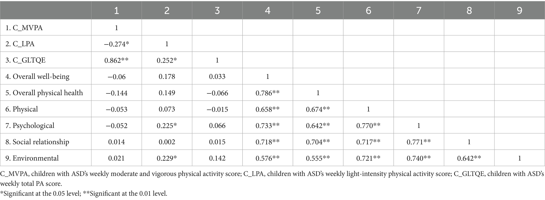 Discussion: These findings underscore the potential of LPA as a feasible and accessible form of joint activity that may support QOL within families of children with ASD. Framed through reciprocal determinism, the results highlight the interconnected roles of children’s PA (behavior), parents’ psychological well-being (personal factor), and the family context (environment). Further longitudinal and intervention studies are warranted to confirm these relationships and inform family-centered PA interventions.