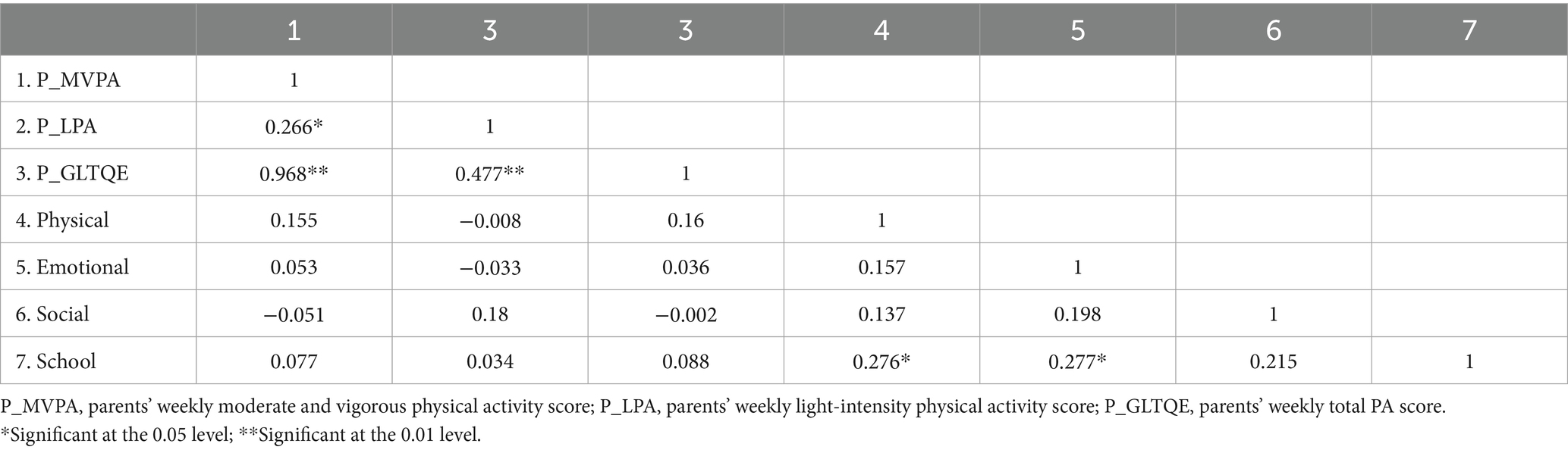 Statistical analyses were performed using IBM SPSS version 26.0. The Kolmogorov–Smirnov test confirmed that all variables were continuous and approximately normally distributed, with skewness and kurtosis ranging from −0.49 to 1.26 and −0.79 to 1.53, respectively (George and Mallery, 2016). To examine associations between PA and QOL in parent–child dyads, partial Pearson correlations were conducted controlling for symptom severity, age, and sex. A significance threshold of p < 0.05 was applied. For interpretive clarity, correlation coefficients were categorized as follows: 0.25 indicating weak, 0.49 moderate, and 0.69 strong correlations (Cohen, 2013).