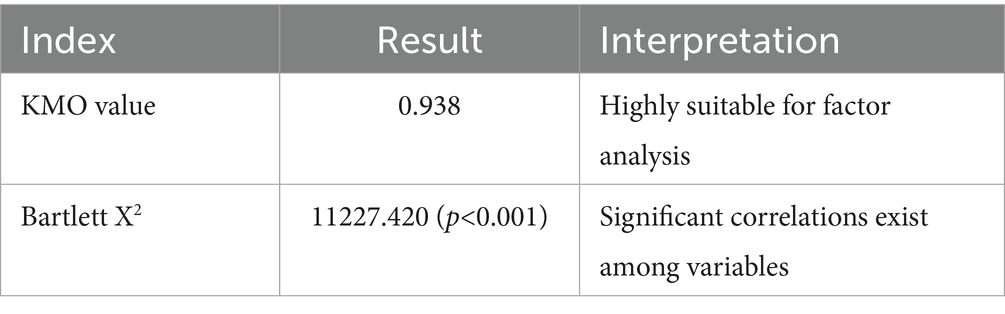 To assess potential common method bias, we applied Harman’s single-factor test via exploratory factor analysis (EFA) on 37 self-reported variables (covering family support, peer interaction, teacher relations, emotional experience, learning ability, etc.). Principal component analysis without rotation was performed in SPSS 26.0, extracting factors with eigenvalues > 1, and the Kaiser–Meyer–Olkin (KMO) and Bartlett’s tests confirmed data suitability. Results showed KMO = 0.938 (> 0.70) and Bartlett’s χ2 = 11,227.420 (df = 1,891, p < 0.001), indicating strong intercorrelations suitable for factor analysis (Table 1).