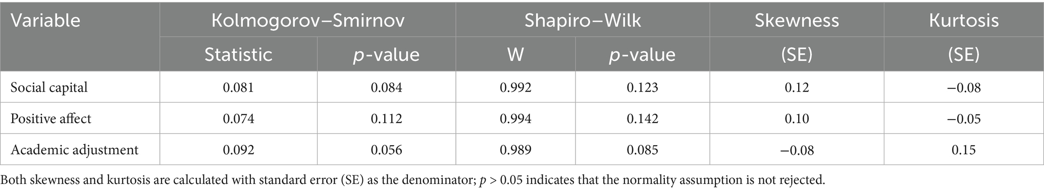 Prior to hypothesis testing, we conducted Kolmogorov–Smirnov (with Lilliefors correction) and Shapiro–Wilk tests on the three primary variables (Social Capital, Positive Affect, Academic Adjustment). All tests were non-significant (p > 0.05), and skewness and kurtosis values fell within ±1, indicating approximate normal distributions suitable for subsequent parametric analyses. The Kolmogorov–Smirnov statistics were non-significant at the 0.05 level, and Shapiro–Wilk W values approached 1. Thus, regression analyses and PROCESS-based mediation and moderation tests proceeded under the assumption of normality (Table 2).