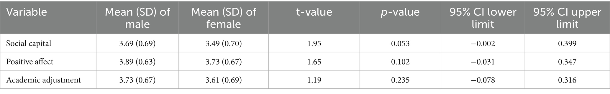 Data were analyzed in SPSS 26.0. First, Levene’s test examined the homogeneity of variances; then independent-samples t-tests compared mean scores between male and female students, with significance set at p < 0.05. Results indicated that on the Social Capital Scale, males had a mean of 3.69 (SD = 0.69) versus females’ mean of 3.49 (SD = 0.70), t (192) = 1.95, p = 0.053 (> 0.05), showing no statistically significant difference. Although males trended slightly higher across subscales, none reached significance. For overall Positive Affect, males’ mean was 3.89 (SD = 0.63) and females’ 3.73 (SD = 0.67), t = 1.65, p = 0.102 (> 0.05), and all sub-emotion comparisons (e.g., joy, contentment, interest) likewise yielded p > 0.05. Thus, no significant gender differences emerged in strength or type of positive emotions. On the Academic Adjustment Scale, males averaged 3.73 (SD = 0.67) and females 3.61 (SD = 0.69), t = 1.19, p = 0.235 (> 0.05), with no significant differences across its dimensions—likely reflecting a fair educational environment (Table 3).