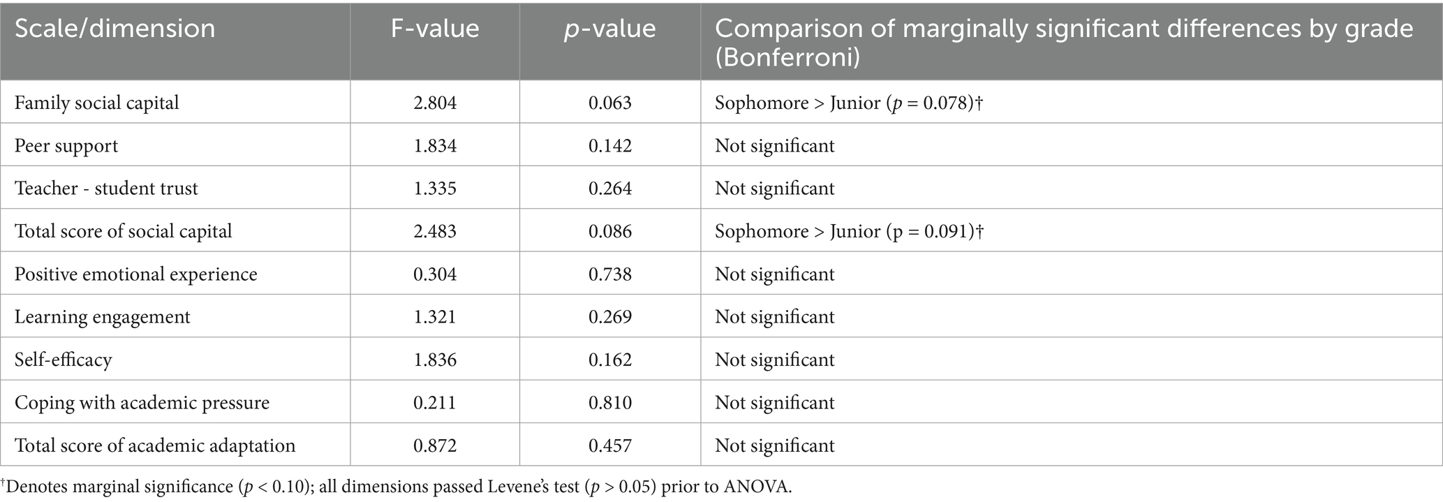 Grade level (freshman/sophomore/junior) served as the independent variable in one-way ANOVAs on total Social Capital, Positive Affect, and each Academic Adjustment dimension. Levene’s tests confirmed homogeneity of variances for Social Capital (F = 1.742, p = 0.178), Positive Affect (F = 0.429, p = 0.651), Learning Engagement (F = 0.982, p = 0.374), Academic Self-Efficacy (F = 1.215, p = 0.297), and Stress Coping (F = 0.156, p = 0.856), justifying ANOVA. Significance thresholds were set at p < 0.10 (marginal) and p < 0.05 (significant).