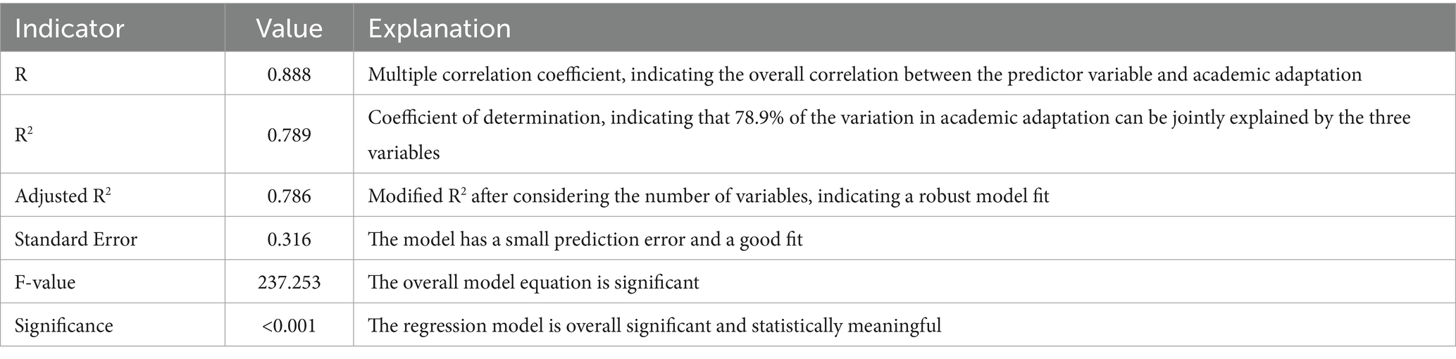 The regression model yielded a multiple correlation coefficient R = 0.888, R2 = 0.789, and adjusted R2 = 0.786, indicating that social capital, positive affect, and psychological resilience collectively explained 78.9% of the variance in academic adjustment. The small difference between R2 and adjusted R2 suggests a well-fitted model given the variable count and sample size. ANOVA for the regression showed F (3, 190) = 237.253, p < 0.001, confirming the model’s overall significance compared to a null model (Table 5).