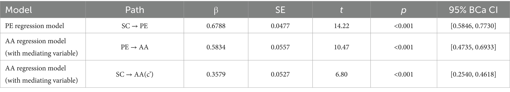 Using PROCESS v4.2_beta (Model 4), we tested whether positive affect (PE) mediates the effect of social capital (SC) on academic adjustment (AA), controlling for gender, grade level, and family economic status. With 5,000 bootstrap samples, mediation is significant if the 95% CI excludes zero. Results indicated that SC predicted PE (path a: coefficient = 0.6788, SE = 0.0477, t = 14.2195, p < 0.001) and PE predicted AA (path b: coefficient = 0.5834, SE = 0.0557, t = 10.4712, p < 0.001). The direct effect of SC on AA, controlling for PE (path c′), remained significant (coefficient = 0.3579, SE = 0.0527, t = 6.7957, p < 0.001) (Table 7).