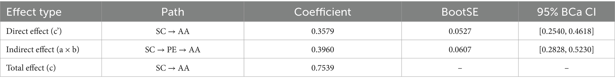 The indirect effect (SC→PE→AA) was 0.3960 (BootSE = 0.0607), 95% CI = [0.2828, 0.5230], excluding zero—indicating a significant partial mediation. Control variables had non-significant effects on PE and AA (p > 0.05). In sum, positive affect partially mediates the relationship between social capital and academic adjustment: social capital both directly enhances adjustment and indirectly facilitates it by boosting positive emotions (Table 8).