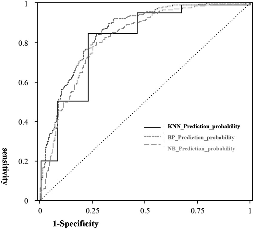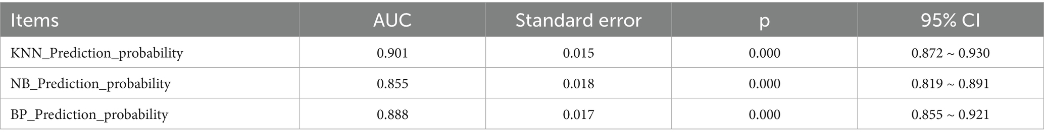 ROC curves were constructed for KNN_Prediction_probability, NB_Prediction_probability, and BP_Prediction_probability, with the three models showing high diagnostic value for turnover prediction. As shown in Table 10, all models demonstrated strong discriminative ability, with the Area Under the Curve (AUC) values all exceeding 0.80, indicating high prediction accuracy. Specifically, the KNN model had the highest AUC value of 0.901 (95% confidence interval: 0.872 ~ 0.930), followed by the BPNN (AUC = 0.888; 95% confidence interval: 0.855 ~ 0.921).