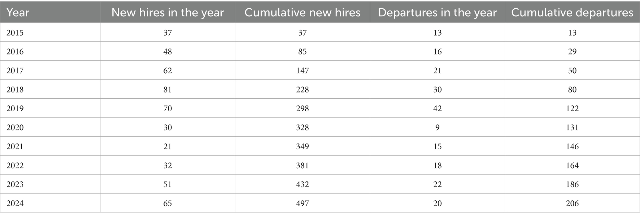 The study adopts a longitudinal tracking design, with data collection spanning from January 2015 to December 2024. As shown in Table 1, over the past decade, University A has recruited 497 young and middle-aged faculty members aged between 26 and 45. Of these, 291 teachers (58.55%) remain, while 206 teachers (41.45%) have left. Personnel records were exported from the university’s human resources management system, and data cleaning was performed using a double-blind entry method. Ethical approval for the study was obtained from the Academic Committee of University A. All participants were informed about the survey, provided informed consent, and were assured of the confidentiality and anonymity of their data. In addition, this study commits to providing feedback on the overall research findings to participants after the completion of the study. Specific methods include disseminating results via university email systems and organizing dedicated results-briefing sessions, ensuring that no personal data is involved during the feedback process. These measures further protect participants’ right to information and privacy.