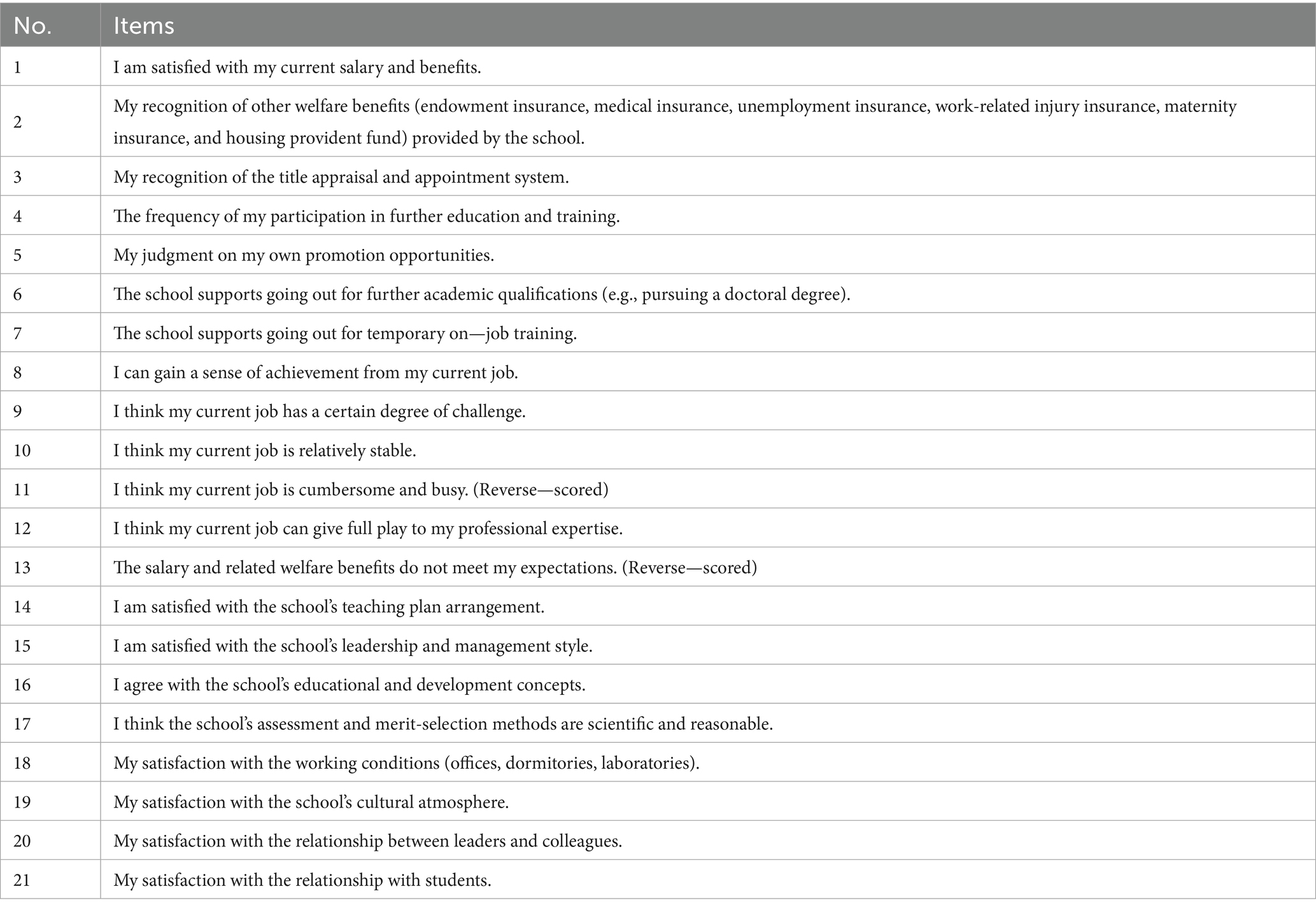 This study was based on the core dimensions of the short-form Minnesota Satisfaction Questionnaire (MSQ) (Weiss et al., 1967), which contains 20 items, and the Job Satisfaction Survey (JSS) (Spector, 1985). The questionnaire was adapted to align with the organizational characteristics of private universities. The resulting “Teacher Satisfaction Survey for Young and Middle-Aged Faculty in Private Universities” was developed (see Table 2). The survey used a Likert 5-point scale and consisted of 21 items. The Cronbach’s α coefficient for the questionnaire was 0.92, indicating strong internal consistency, with a content validity of 0.91. Additionally, the item discrimination was found to be satisfactory.