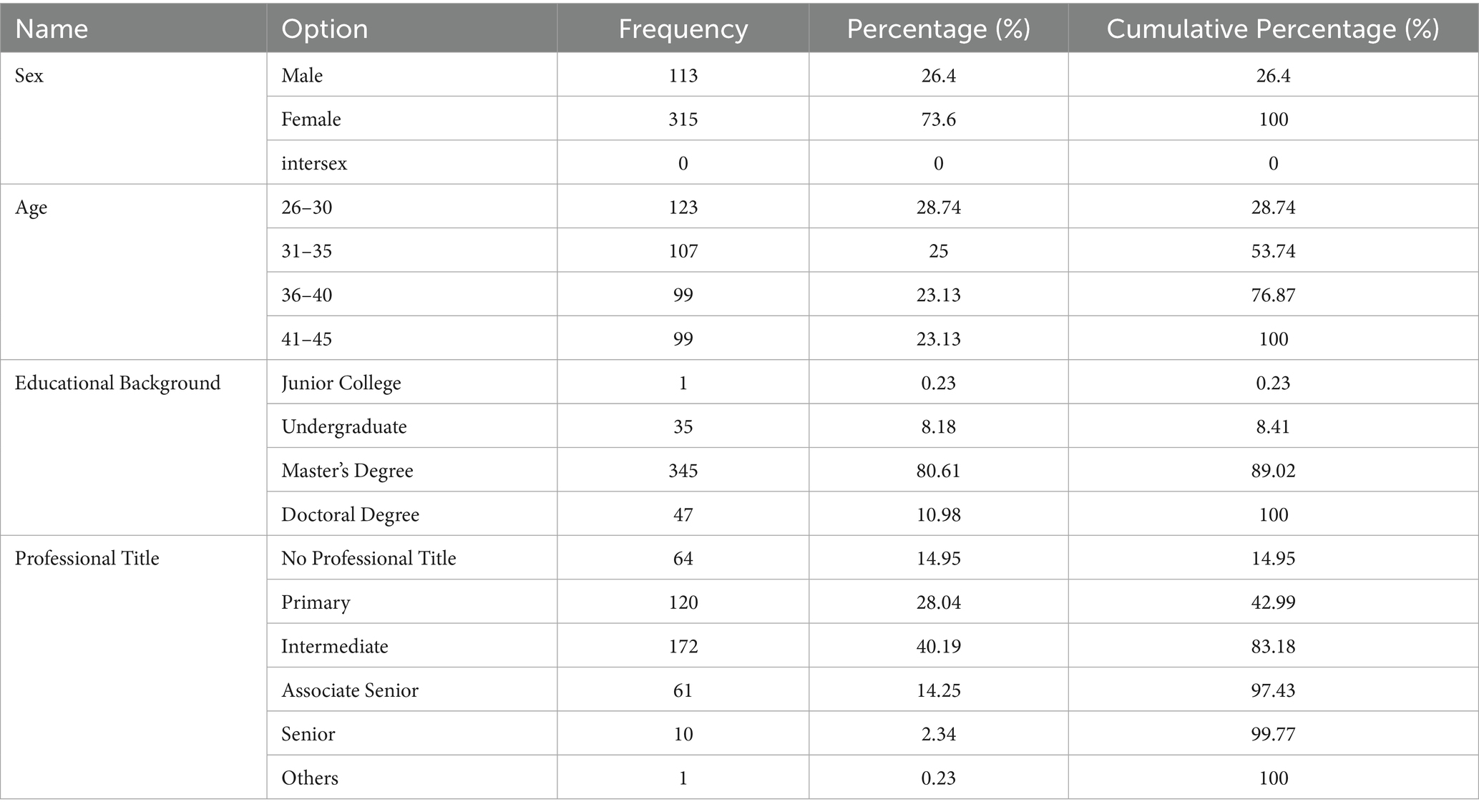 This study utilized the university’s human resource management system to conduct an annual tracking survey of faculty satisfaction each December. To ensure a fair comparison of satisfaction levels between teachers who left and those who remained, the analysis uniformly used the most recent questionnaire results obtained during each teacher’s period of employment. Specifically: (1) for teachers who had left, data from their most recent annual survey before departure were used; (2) for teachers still employed, data from the latest survey (December 2024) were used. This approach ensured that all satisfaction data were sourced from the most recent available point in each teacher’s career, effectively capturing their latest state either prior to leaving or while currently employed. This method effectively mitigates measurement errors that could arise from differences in career stages or recent events. Following the above screening and data cleaning procedures, a total of 428 valid questionnaires were included in the final analysis, comprising 227 from currently employed teachers and 201 from those who had left. The distribution of the surveyed teachers by gender, age, educational background, and professional title is presented in Table 3.