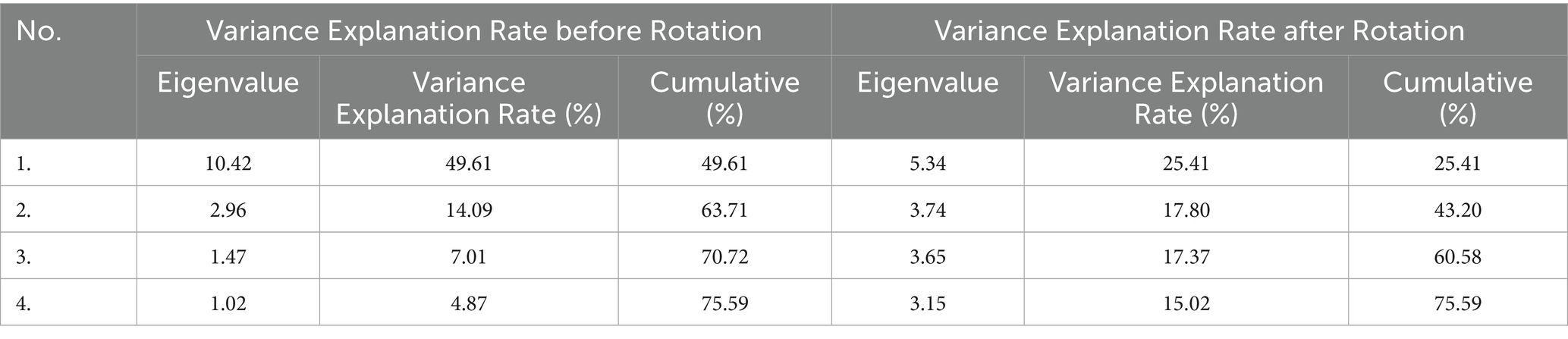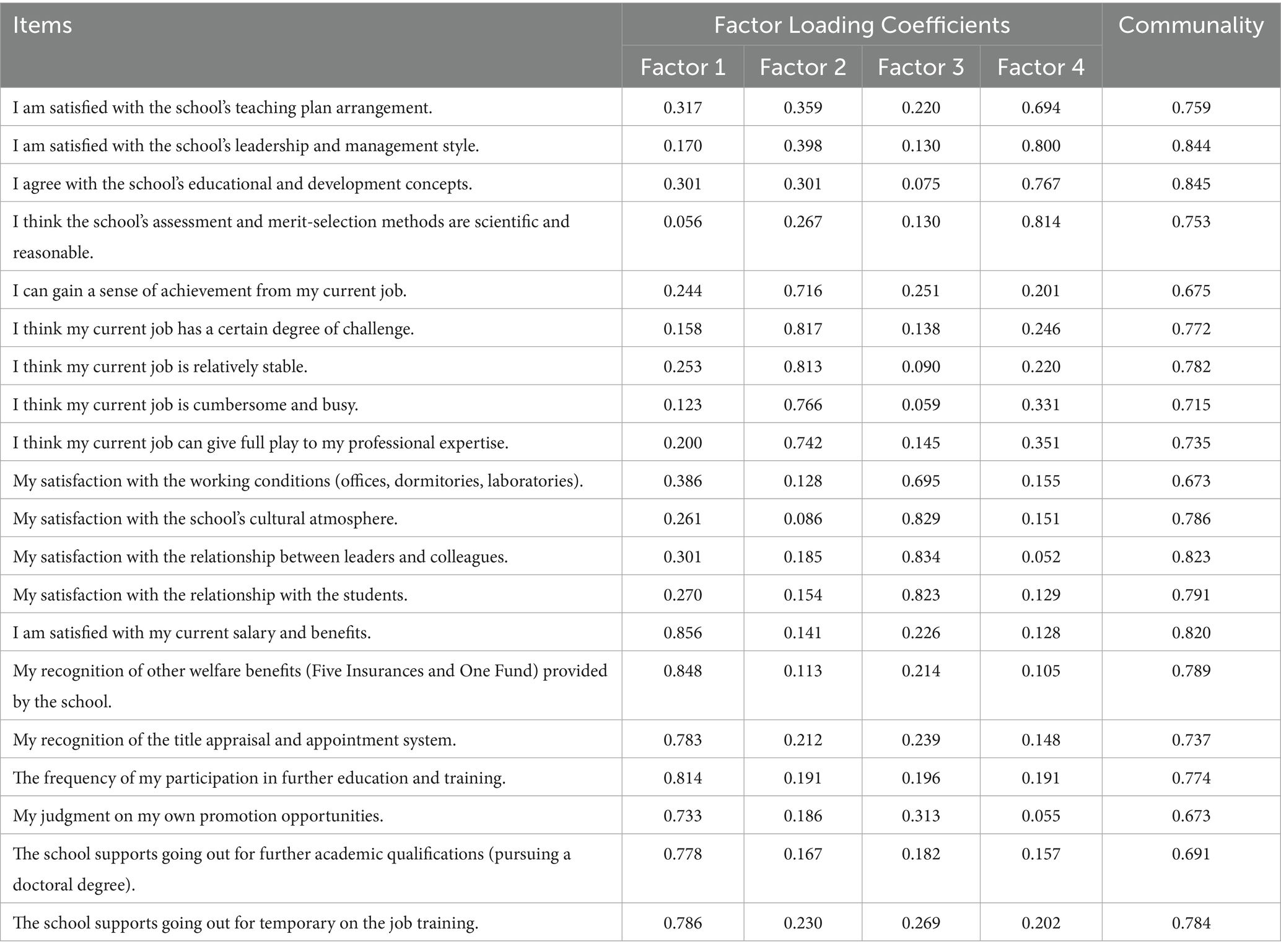 Using the maximum variance rotation method, the variance explained by the first four factors is presented in Table 4. After rotation, the first four factors had eigenvalues greater than 1, and the cumulative variance explained reached 75.59%. Thus, the first four factors were extracted, which successfully condensed the information from the stability survey for young and middle-aged faculty. The variance explained by factor 1 after rotation was 25.41%, which was higher than the variance explained by the other factors, indicating that factor 1 is the most important factor influencing teacher turnover.