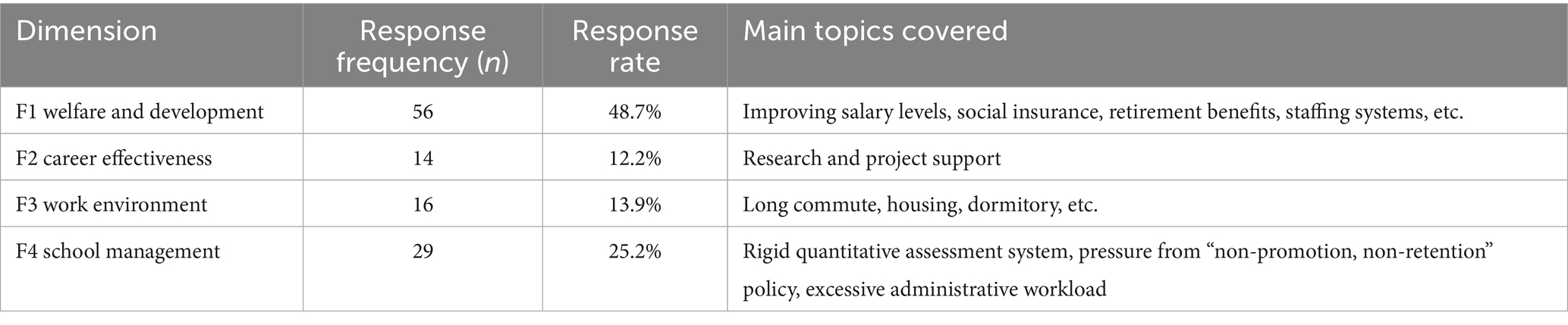 The school management dimension (F3) ranked second (n = 29, 25.2%). Respondents primarily suggested improvements regarding the rigidity of the quantitative assessment mechanism (frequency 15), the pressure from the "up-or-out" policy (frequency 9), and the excessive burden of administrative tasks (frequency 8). Representative excerpts included: