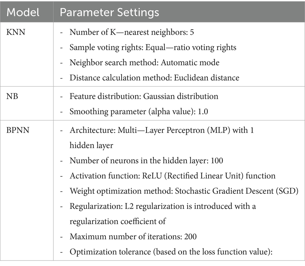 (2) Naive Bayes (NB) is based on Bayes’ theorem and assumes feature independence. It is simple, efficient, and well-suited for processing high-dimensional data (Jadhav and Channe, 2016).