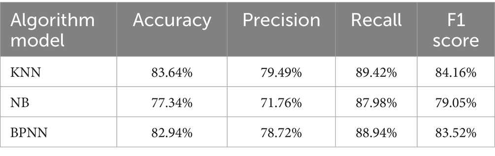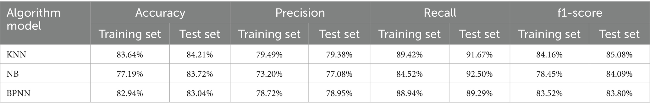 The prediction results of the models on the training and test sets are shown in Table 8. On the training set, both KNN and the BPNN demonstrated the highest classification capability, with accuracies of 84.21 and 83.04%, respectively. Their recall rates both exceeded 85%, indicating that these two types of models can effectively identify positive samples within the target category. On the test set, although NB had the lowest accuracy on the training set (77.19%), it exhibited generalization ability comparable to the best model on the independent test set, with an accuracy of 83.72% and an F1-score of 84.09%.