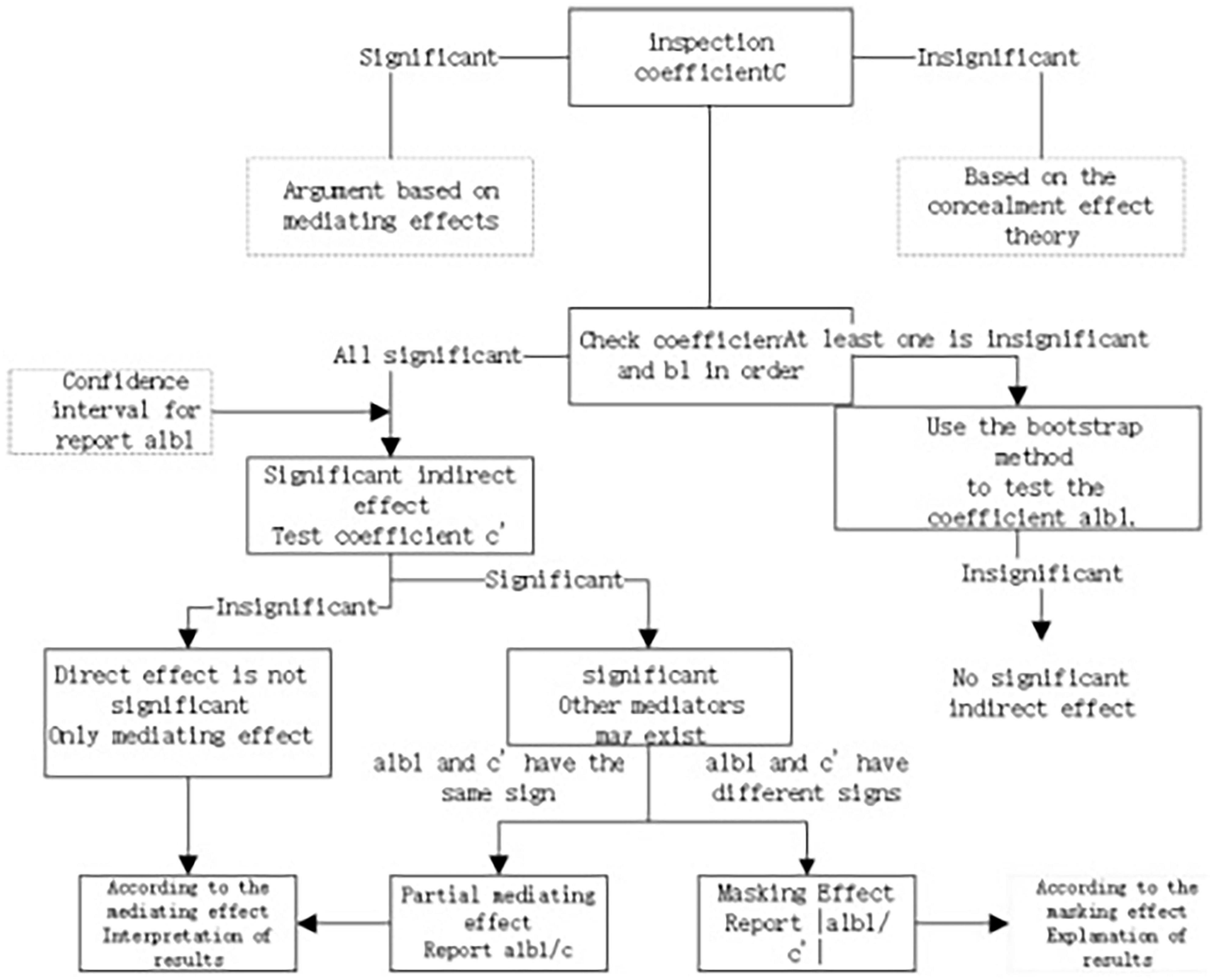 Step 5: Compare the signs of ab and c’. If the signs are the same, the result indicates a partial mediating effect, and the reported value is the ratio of the mediating effect to the total effect, i.e., ab/c. If the signs are different, the result reflects a masking effect, and the reported value is the absolute value of the ratio of the indirect effect to the direct effect, i.e., | ab/c’|.