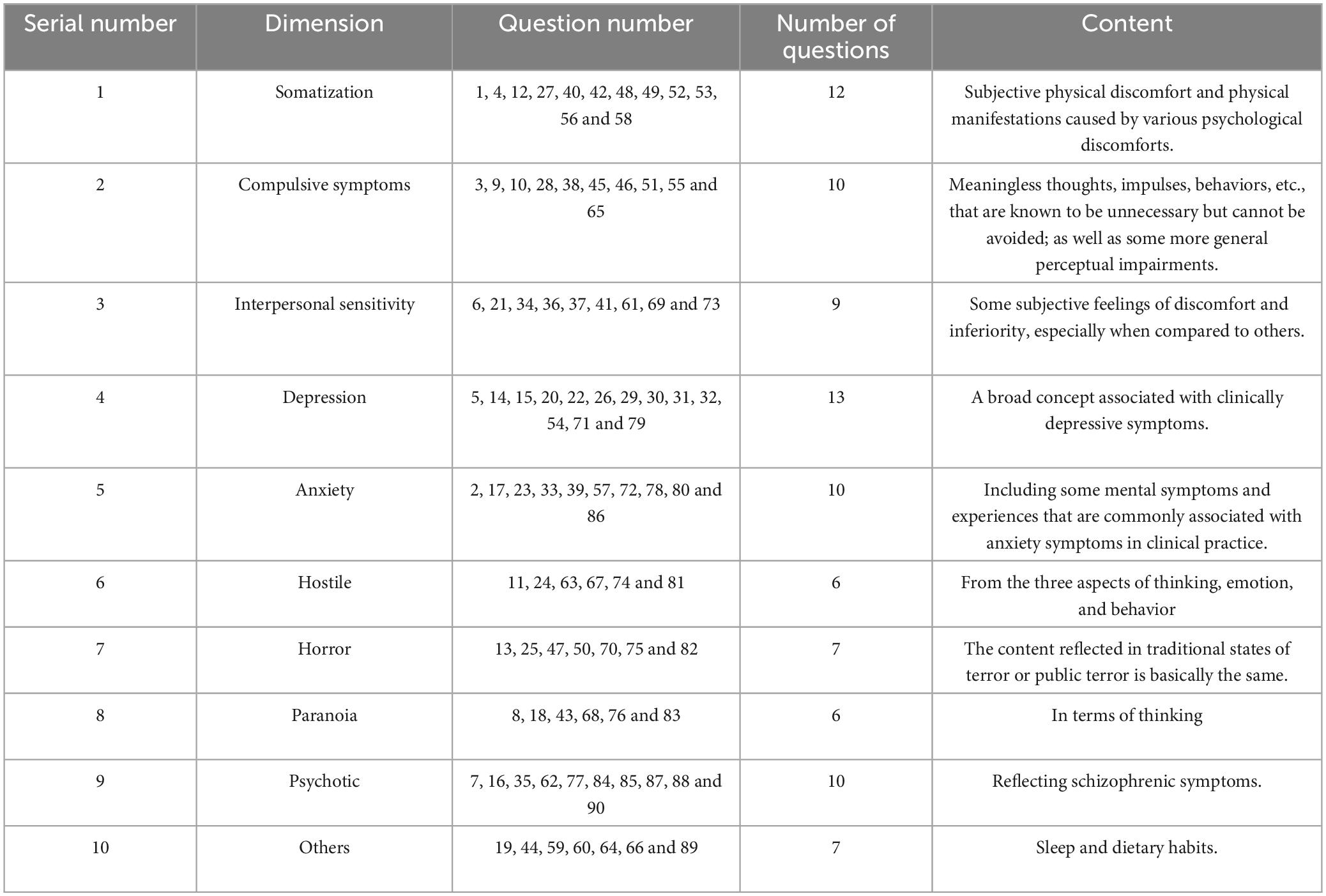 The dependent variable in this study is adolescent psychological resilience. Psychological resilience refers to an individual’s capacity to recover from adversity and setbacks, including trauma, negative life events, chronic stress, illness, and the broader influences of family and society (Wang and Hongbo, 2023). To assess psychological resilience, this study utilized the Self-Rating Questionnaire for Symptoms (SQL-90), a comprehensive mental health questionnaire included in the Adolescent Health Theme Database. The SQL-90 consists of 93 items across 10 dimensions. The specific dimensions and corresponding item numbers are shown in Table 1.