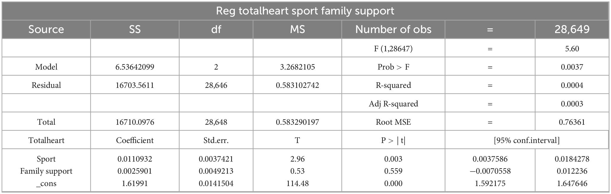 After calculating the mean of the two components of physical exercise, the total effect was tested. According to the regression results, the total effect coefficient c between the independent variable x (sport) and the dependent variable y (totalheart) in Equation (1) is statistically significant. This indicates a positive correlation between physical exercise and psychological resilience. Specifically, both indicators of physical activity—exercise frequency and exercise intensity—contribute to reducing symptoms of depression, anxiety, hostility, and fear, thereby enhancing adolescents’ overall mental health. As presented in Table 3, the presence of a significant total effect supports the existence of a meaningful relationship between physical exercise and psychological resilience, thereby confirming Hypothesis 1.
