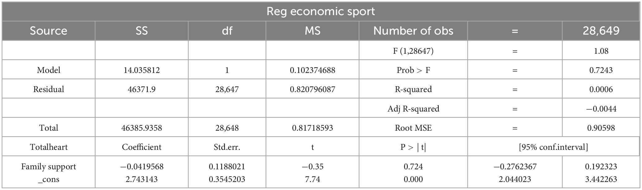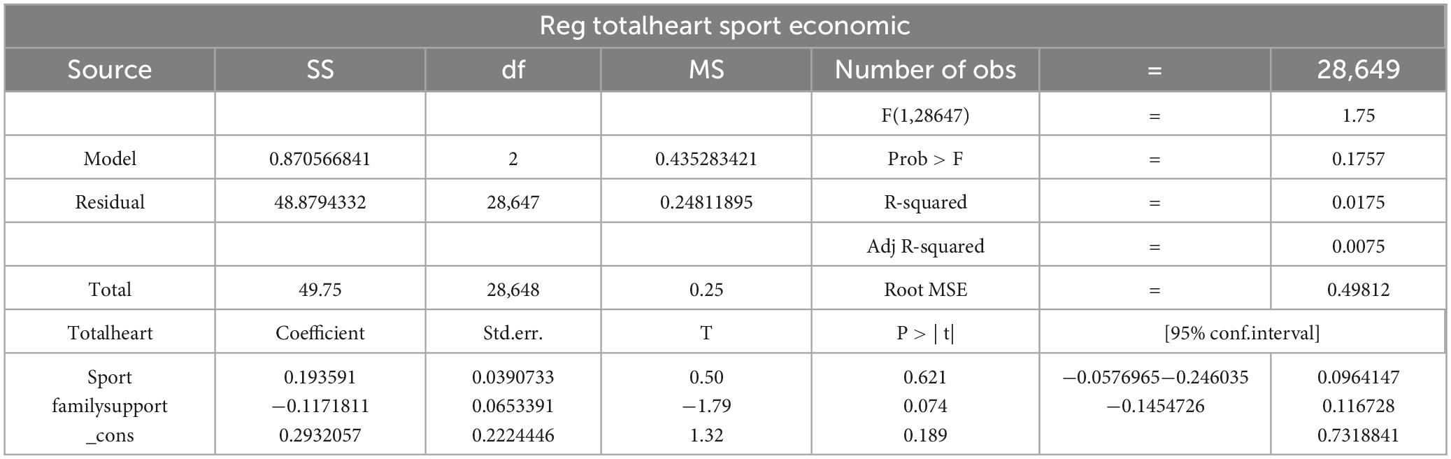 As shown in the table below, the p-value for the relationship between physical exercise and SES is 0.7, which is substantially higher than the conventional significance threshold of 0.05. This indicates that the coefficient a2 in the regression model is not statistically significant. Furthermore, when testing the mediation pathway from physical exercise through SES to psychological resilience, the p-value obtained was 0.17, still exceeding the acceptable significance level. These results demonstrate that SES does not have a significant mediating effect between physical exercise and psychological resilience. Consequently, Equations (4) and (5), along with Hypothesis 3, are not supported by the data.