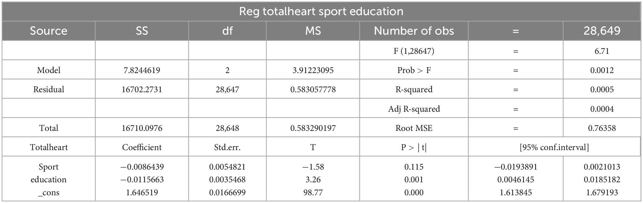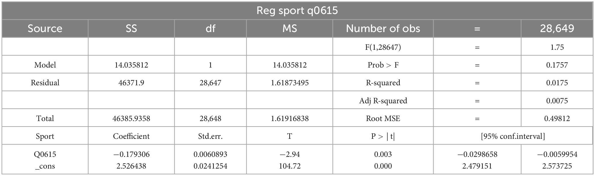 The mediation effect was tested using a series of regression analyses. First, following the framework proposed by Baron and Kenny, the total effect of the independent variable on the dependent variable was examined to determine whether physical exercise significantly influences psychological resilience. The independent variable, physical exercise, was measured through two components: exercise frequency (Q0913: How many days in the past 7 days did you exercise for more than 30 min?) and exercise intensity (Q0917: How many sports interest classes did you participate in over the past 12 months?). These components were tested separately using Stata software. The results (see the table below, where the coefficient represents the standardized regression coefficient and Prob > F indicates the significance level) show that both exercise frequency and exercise intensity have a significant positive effect on mental health at the 5% significance level.
