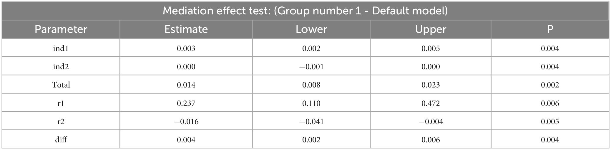 From top to bottom, the table displays the values of the two indirect effects, the total effect, the proportion of each indirect effect relative to the total effect, and the difference between the two indirect effects. The bootstrap confidence intervals for both mediating paths—family support and peer relationships—were analyzed. The confidence interval for Mediating Effect 1 is [0.02, 0.05], while the confidence interval for Mediating Effect 2 is [−0.01, 0.00]. Since neither intervals do not cross zero, the mediating effects are statistically valid. The proportion of Mediating Effect 1 to the total effect is 0.237, indicating a substantial contribution, while Mediating Effect 2 accounts for only −0.016 diff value has a confidence interval that does not include zero, demonstrating that Mediating Effect 1 is significantly stronger than Mediating Effect 2.