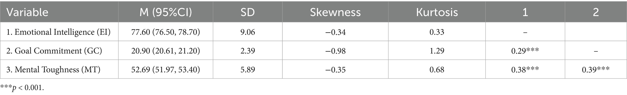 Table 1 presents the descriptive statistics and Pearson correlation coefficients for EI, GC, and MT. Within a 95% confidence interval, the mean scores were as follows: EI (M = 77.60, [76.50, 78.70], SD = 9.06), GC (M = 20.90, [20.61, 21.20], SD = 2.39), and MT (M = 52.69, [51.97, 53.40], SD = 5.89). Skewness and kurtosis values within approximately ±2 are often considered acceptable for normality in applied research (George and Mallery, 2016). Correlation analysis showed positive and significant relationships between EI and GC (r = 0.29, p < 0.001) and between EI and MT (r = 0.38, p < 0.001). Additionally, GC and MT had a moderate positive correlation (r = 0.39, p < 0.001), confirming the theoretical expectation of positive interrelations among the key study variables.