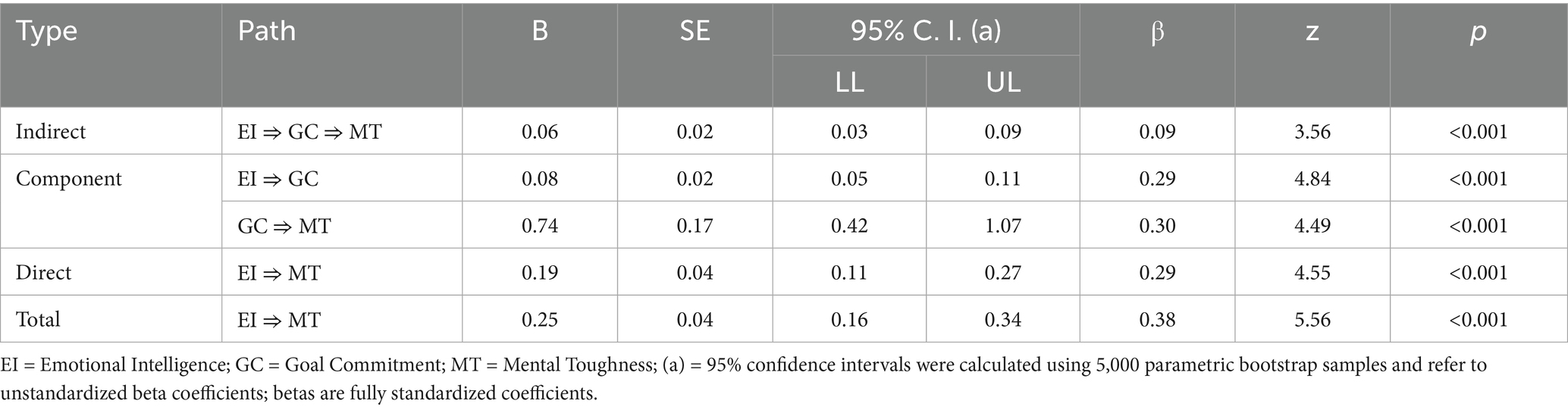 The mediation analysis results support H4, indicating that GC partially mediates the association between EI and MT. Approximately one-quarter of the total association between EI and MT is accounted for via GC. This pattern is consistent with emotionally intelligent athletes showing higher resilience-related attributes, with goal commitment representing a potential correlational pathway. This finding aligns with the theoretical propositions of Mayer and Salovey’s (1997) EI model and Fredrickson’s (2001) broaden-and-build theory, which emphasize that positive emotion and emotional clarity promote motivation and cognitive flexibility. Empirical evidence also supports this pathway– emotionally intelligent athletes demonstrate stronger motivational focus, self-regulatory skills, and social adaptiveness, which enhance both their GC and toughness (Cowden, 2016; Laborde et al., 2018; Mitić et al., 2020; Montenegro-Bonilla et al., 2024).