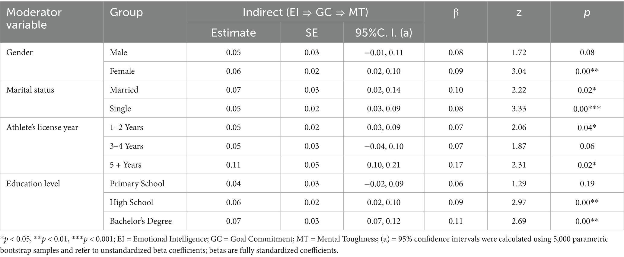 The moderating roles of demographic variables were further examined within the GLM mediation framework, with conditional indirect associations reported in Table 3. For gender (H5), the indirect association of EI with MT via GC was significant among female athletes (β = 0.09, p < 0.01) but not among male athletes (β = 0.08, p > 0.05), indicating moderation by gender. For marital status (H6), the indirect association was significant for both married (β = 0.10, p < 0.05) and single (β = 0.08, p < 0.001) participants, suggesting that marital status does not significantly moderate the mediation pathway. For athlete’s license year (H7), the indirect association was significant among athletes with 1–2 years (β = 0.07, p < 0.05) and ≥ 5 years of experience (β = 0.17, p < 0.05), but was non-significant for those with 3–4 years of experience (β = 0.07, p = 0.06), indicating partial support for moderation by sport experience. For educational status (H8), significant indirect associations were found for high school graduates (β = 0.09, p < 0.01) and college graduates (β = 0.11, p < 0.01), while the path was non-significant for primary school graduates (β = 0.06, p = 0.19). Collectively, these findings indicate that the indirect association between EI and MT through GC varies by gender, sport experience, and educational level, but not by marital status.