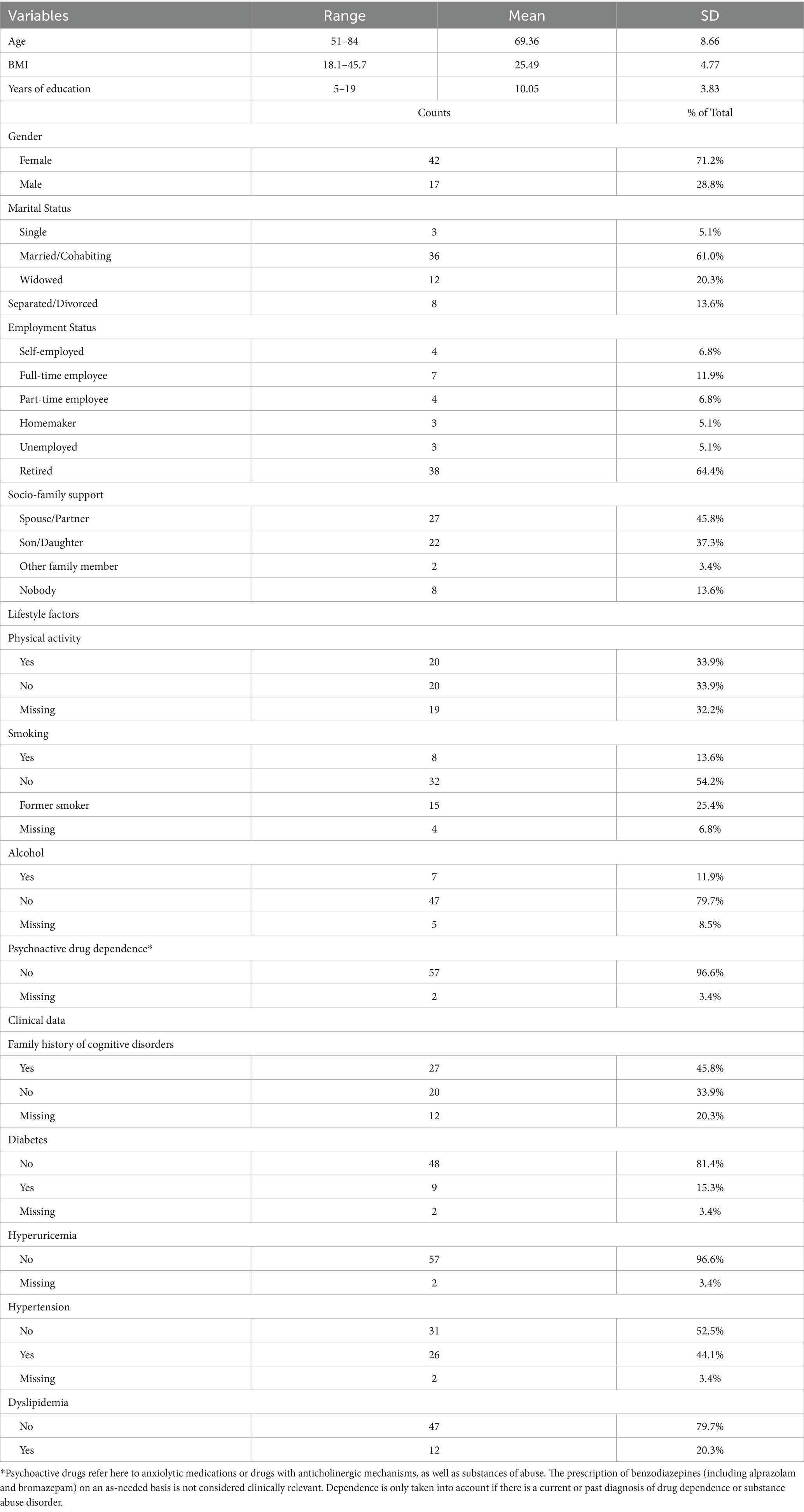 The sample consisted of 59 participants who were predominantly older (69.36 ± 8.66), in retirement with moderate levels of education and a relatively high prevalence of cardiovascular risk factors (Table 1). Specifically, the mean age was 69.36 years (SD = 8.66), with an average of 10.05 years of education (SD = 3.83). Regarding marital status, the majority were married or cohabiting (61.0%), followed by widowed individuals (20.3%). Most participants were retired (64.4%), while smaller proportions were still full-time employees (11.9%). In terms of social support, nearly half of the participants (45.8%) reported their spouse/partner as the primary caregiver in case of need, followed by their children (37.3%). Concerning lifestyle habits, physical activity was reported by 33.9%, while an equal percentage reported no physical activity. Smoking behavior indicated that 13.6% were current smokers and 25.4% were former smokers.