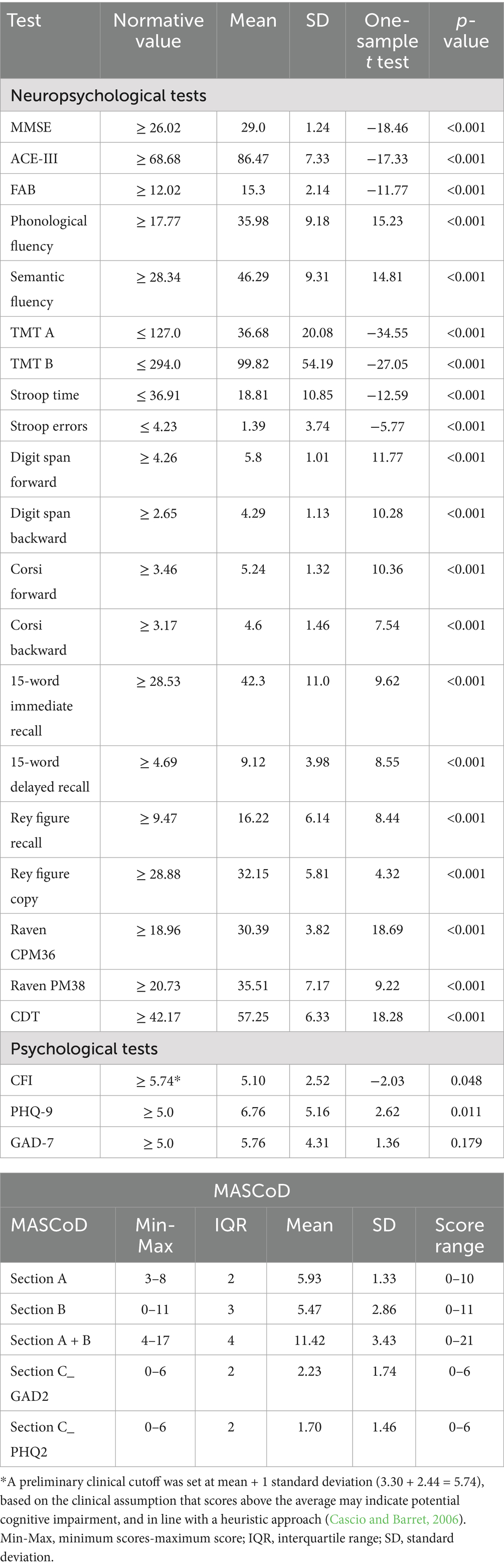 The neuropsychological profile of the sample revealed cognitive performance significantly above the population minimum normative values across all domains (Table 2), as expected in SCD. Indeed, the fixed benchmark values used for comparison represent the lower limit of normal performance, corresponding to the clinical cut-off for normal functioning, that is equivalent score = 1 (Facchin et al., 2022).
