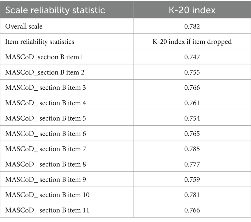 Internal consistency reliability of MASCoD Section B was assessed using Kuder–Richardson Formula 20 (KR-20) to determine the influence of individual dichotomous items on the total scale reliability.