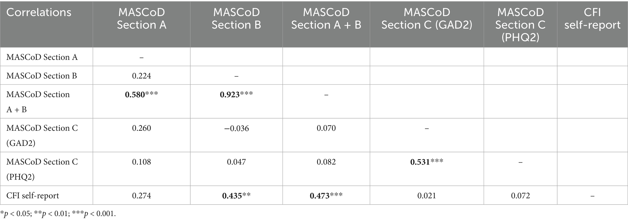 Table 4 presents the Pearson correlation coefficients among the different sections of the MASCoD and the CFI self-report.