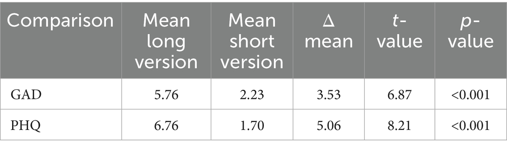 To assess convergence between short and long forms in this population, paired sample t-tests compared the short (GAD-2, PHQ-2) and long (GAD-7, PHQ-9) forms of anxiety and depression assessments, examining differences in symptom severity estimation (aim 3a).