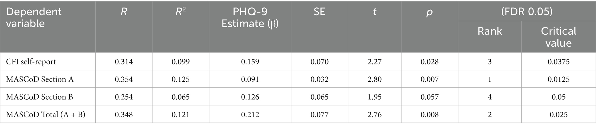 Finally, linear regression models, weighted by participants’ years of education, were employed to evaluate the predictive value of depressive symptoms (PHQ-9 scores) on SCD outcomes, including CFI, MASCoD (Section A, Section B, and the composite A + B scores) (aim 3b).