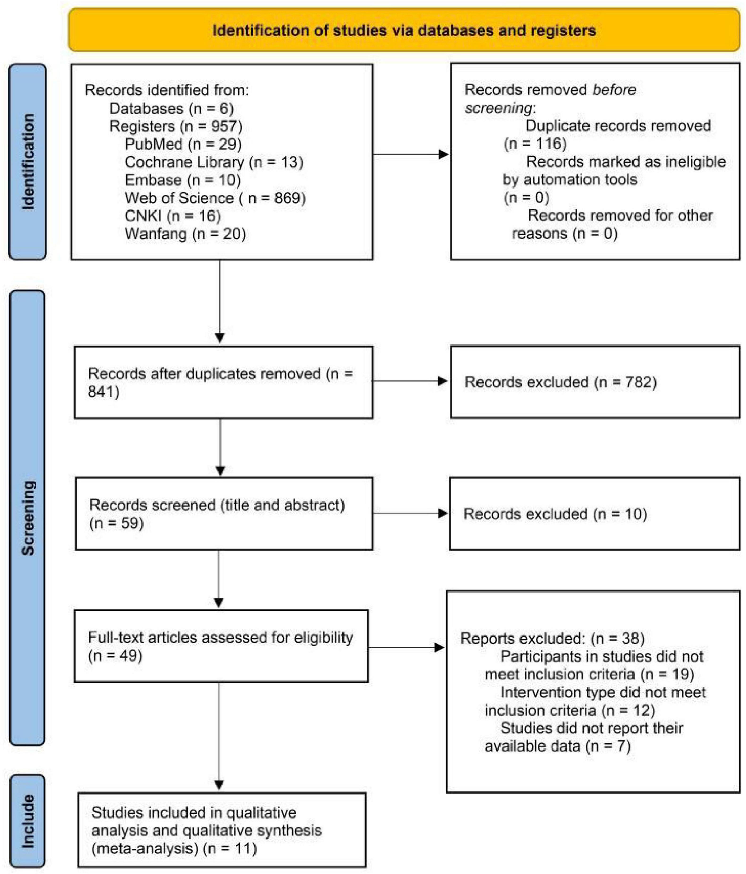 A total of 957 studies were initially screened. We first used the automatic duplicate detection feature in EndNote X9 software to remove 116 duplicated publications. Subsequently, two reviewers independently screened the titles and abstracts of the remaining 841 articles based on inclusion and exclusion criteria. At this stage, meta-analyses, review articles, and cross-sectional studies were further excluded via EndNote, leaving 59 articles to proceed to the next screening phase. In the second round, full-text screening identified studies lacking POMS scale scores or with inaccessible data, resulting in the inclusion of 11 studies in the meta-analysis (Figure 1).