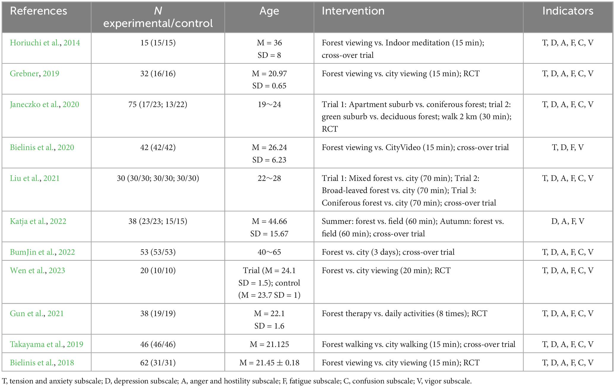 Based on the PICOS criteria in evidence-based medicine. PICOS is a standardized framework used in systematic reviews to structure clinical questions. Its five letters stand for: P (Population): Study subjects; I (Intervention): Intervention measures; C (Comparison): Control measures; O (Outcome): Outcome measures; S (Study design): Research design (Mehrdad and Ali, 2020). The inclusion criteria for the literature were as follows: (1) the population consisted of adults aged 18–75 years; (2) the intervention involved forest therapy, forest viewing, or other activities that facilitated contact with the forest environment (e.g., meditation, sitting, viewing, walking, or a combination of these activities); (3) the comparison group included indoor, urban, or other control groups that were distinct from the forest therapy intervention; (4) the outcome measures include the mood state scale, a widely used self-report psychological assessment tool designed to evaluate an individual’s transient emotional state, subjective assessments (e.g., depression, anxiety, happiness, vitality, recovery, etc.), or physiological and biochemical markers (e.g., blood pressure, heart rate, salivary cortisol, adrenaline, brain waves, etc.); and (5) the study design was a randomized controlled trial (RCT).