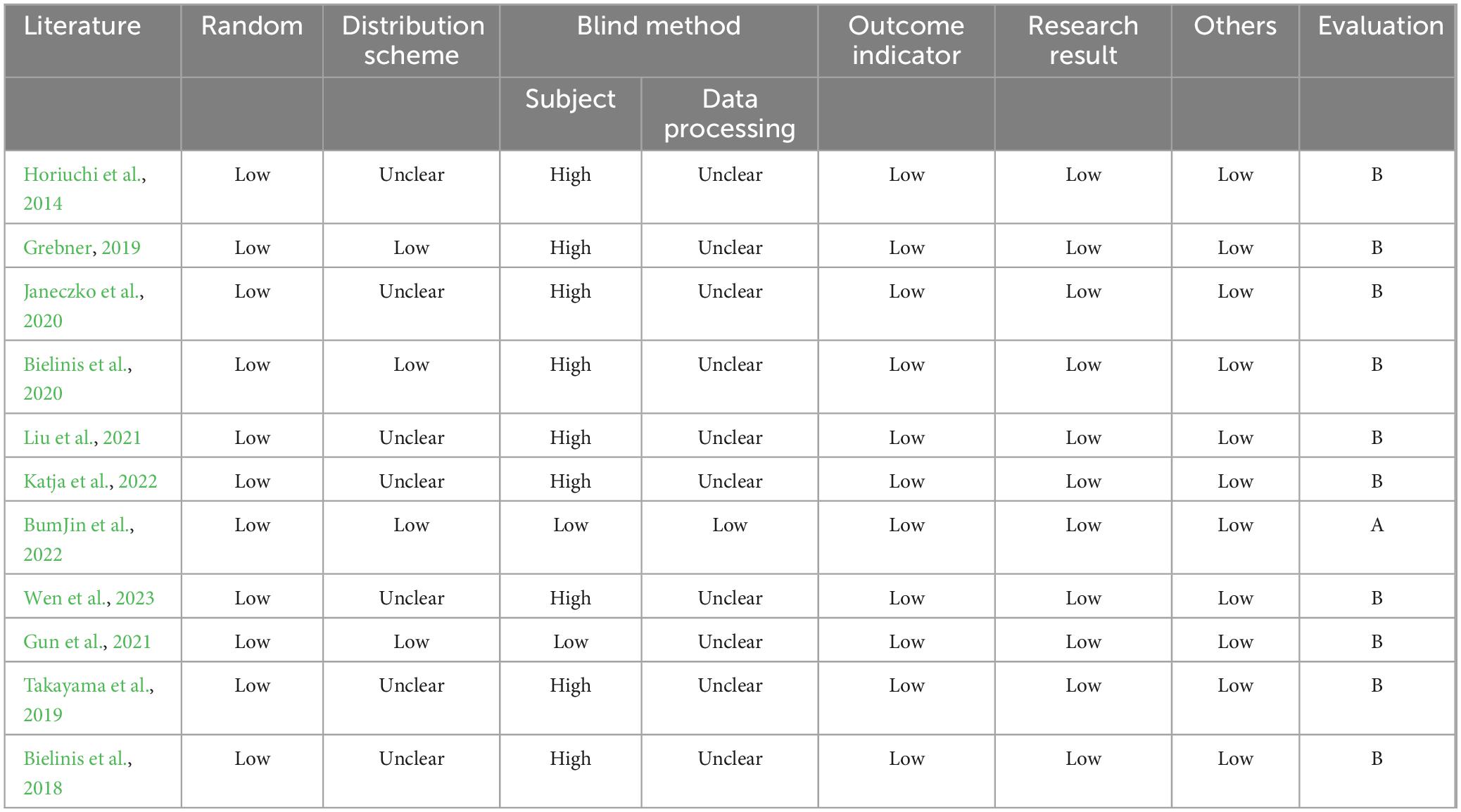 A total of 15 randomized controlled trials (RCTs) were included across 11 studies (Table 2). Of these, only one study described the randomization method, while the remaining studies indicated randomization but did not provide a clear description of the method. Therefore, the “unclear” option was selected for the random sequence generation criterion. If the text indicated that informed consent was obtained, it was assumed that the participants were not blinded. Given the absence of significant dropout cases, the inclusion of indicators other than the POMS scale, and the comprehensive nature of the reported indicators, no evidence of selective reporting was found. As a result, the “low risk” option was selected for other evaluation criteria. The overall quality of the 11 studies was high.