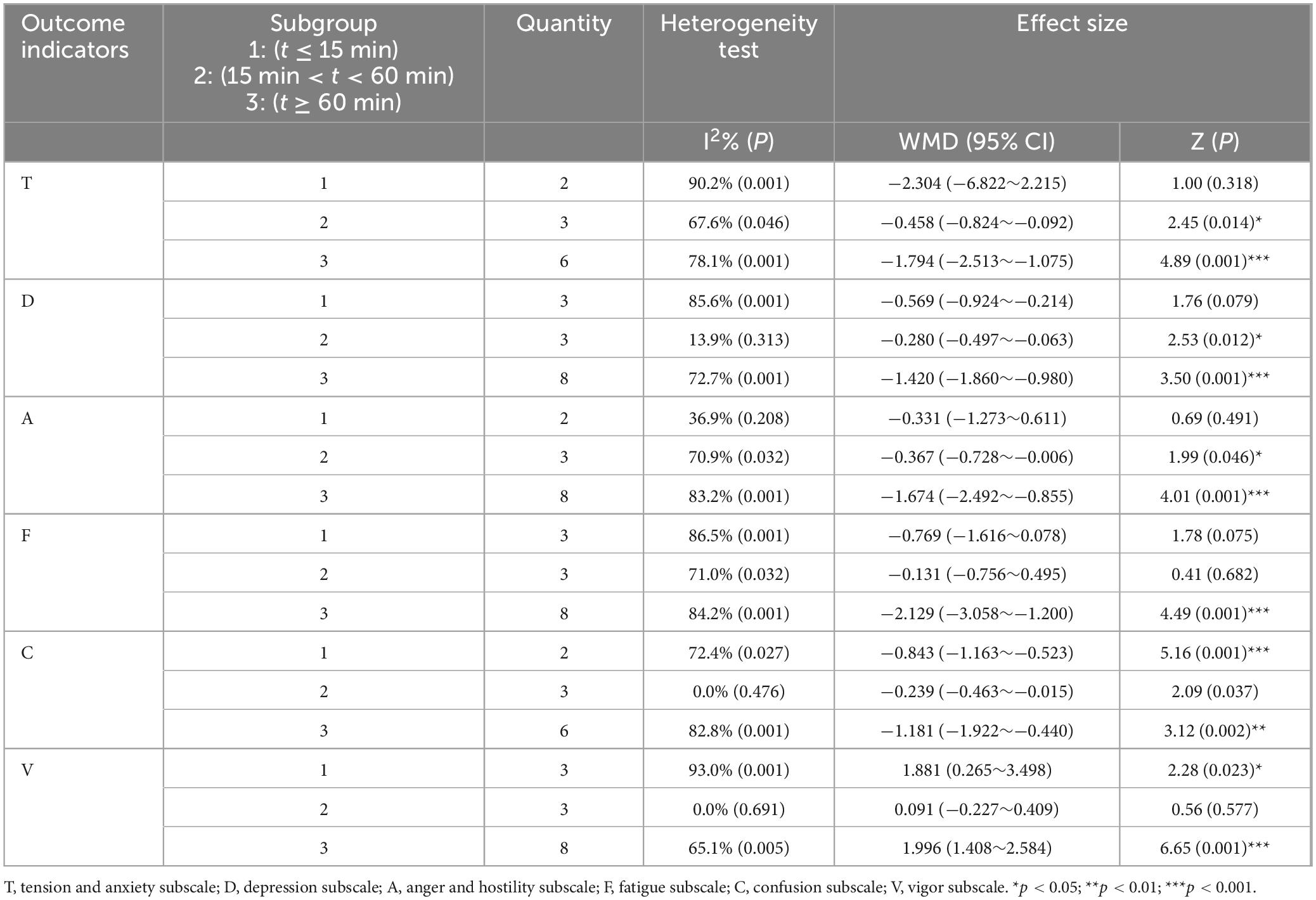 The results of the subgroup analysis and heterogeneity test based on different intervention durations are presented in Table 3. The T-scale score was used as the outcome variable. For subgroup 1, the combined effect size indicated that, compared to the control group, the experimental group showed reduced tension-anxiety mood; however, the effect size was not significant (Z = 1.00, P = 0.318), despite a large effect size (WMD = −2.304). In subgroup 2, the effect size of the experimental group was significantly lower than that of the control group, with a significant reduction in tension-anxiety mood (Z = 2.45, P = 0.014), corresponding to a medium effect size (WMD = −0.458). In subgroup 3, the experimental group showed a significant reduction in tension-anxiety mood compared to the control group (Z = 4.89, P = 0.000), with a large effect size (WMD = −1.794). Additionally, the effect size results for subscale scores of D, A, F, C, and V as outcome indicators all suggested that the experimental group exhibited greater mood improvement. However, the effect sizes for subgroup 1 in indicators D, A, and F were not significant. In subgroup 2, the effect sizes for indicators F, C, and V were not significant. By contrast, all indicators in subgroup 3 showed significant effect sizes. These results suggest that longer-duration forest therapy activities are more effective in improving both positive and negative psychological states, with specific effect size levels shown in Table 3.