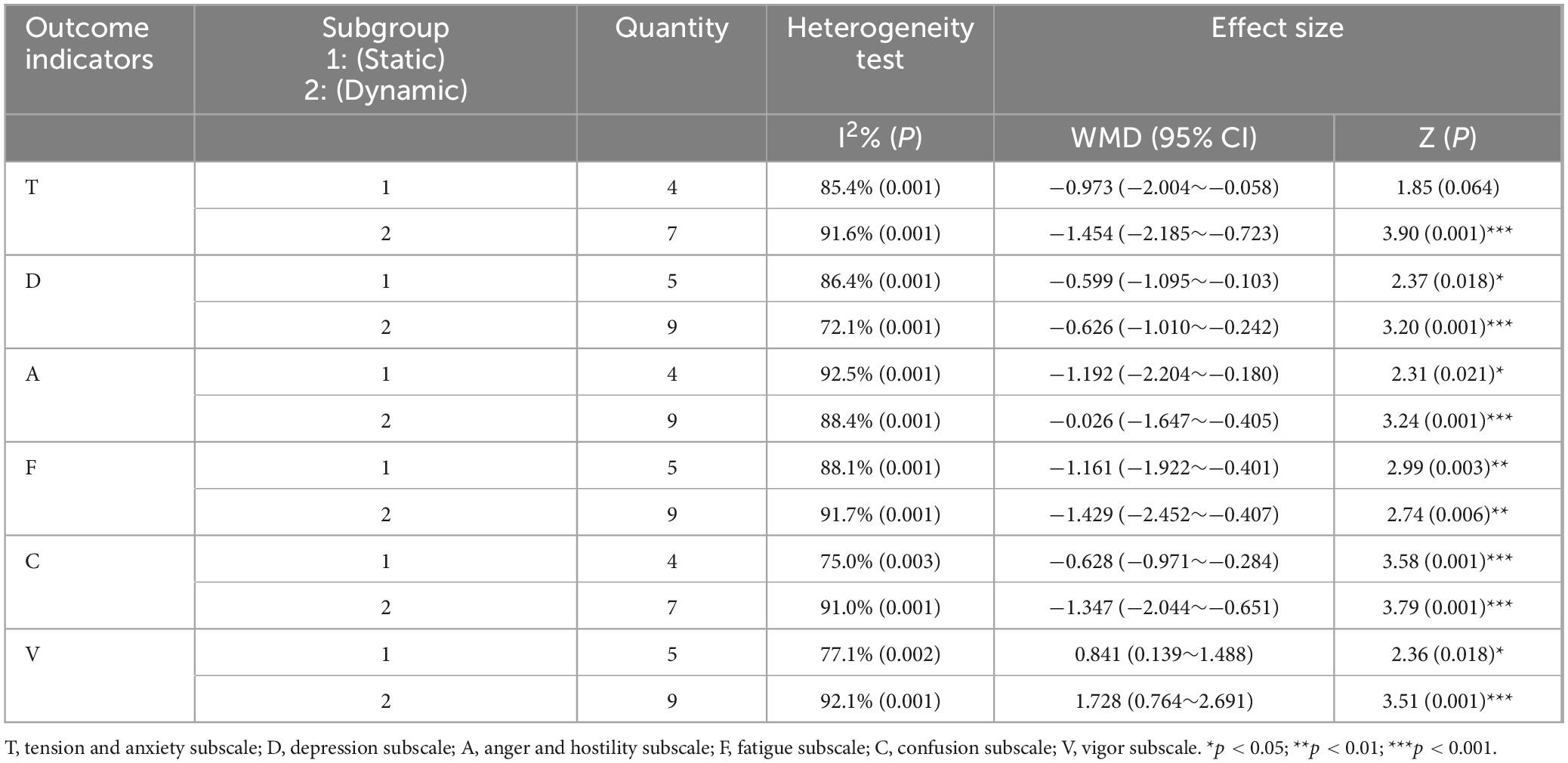 The results of the subgroup analysis and heterogeneity test based on different physical activity patterns are presented in Table 4. Using the T-scale score as the outcome variable, the combined effect size for subgroup 1 indicated that the experimental group showed lower tension-anxiety mood compared to the control group, but the effect size was not significant (Z = 1.85, P = 0.064). In subgroup 2, the experimental group exhibited significantly lower tension-anxiety mood than the control group (Z = 3.90, P = 0.000), with a large effect size (WMD = −1.454). Additionally, the combined effect sizes for the D, A, F, C, and V subscales as outcome indicators all suggested that the experimental group demonstrated greater mood improvement. The effect sizes for both subgroup 1 and subgroup 2 were significant (P < 0.05). However, the absolute effect sizes for the dynamic subgroup were generally larger than those for the static subgroup, with a higher significance level (P < 0.01). Based on these findings, dynamic forest therapy activities are more effective in improving both positive and negative psychological states than static forest therapy activities, with specific effect size levels presented in Table 4.