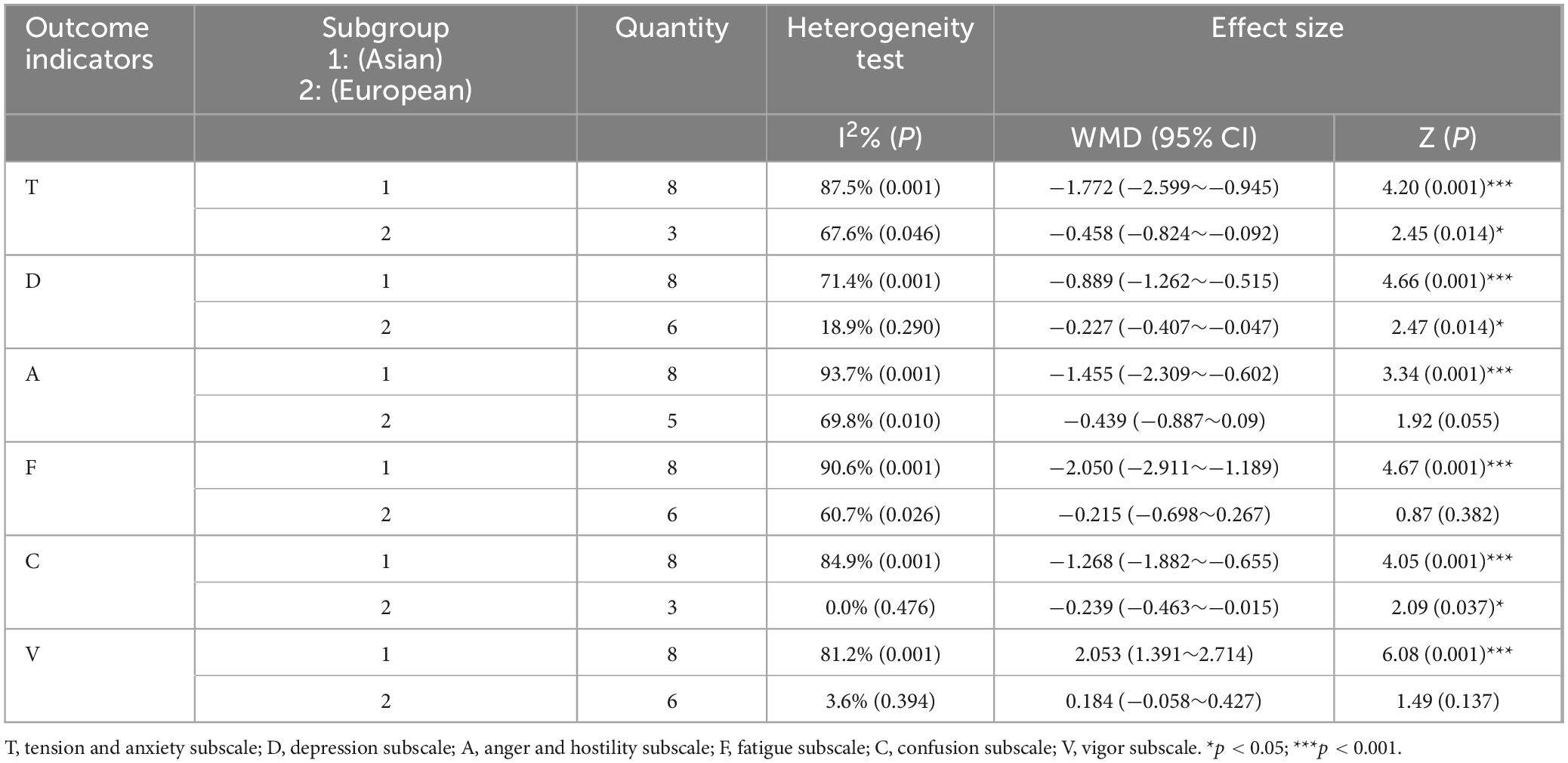The results of the subgroup analysis and heterogeneity test based on participants’ ethnic origins are presented in Table 5. Using the T-scale score as the outcome variable, the combined effect size for subgroup 1 showed that the experimental group had a significant reduction in tension-anxiety mood compared to the control group (Z = 4.20, P = 0.000), with a large effect size (WMD = −1.772). For subgroup 2, the experimental group also showed a significant reduction in tension-anxiety mood compared to the control group (Z = 2.45, P = 0.014), with a moderate effect size (WMD = −0.458). Additionally, using the D, A, F, C, and V subscale scores as outcome indicators, the combined effect sizes for the Asian subgroup indicated a significantly better mood improvement in the experimental group (P < 0.001). In contrast, for the European subgroup, the combined results for the A, F, and V scores showed improved mood in the experimental group, but the effect size was not significant (P > 0.05). The results suggest that the effects of forest therapy appeared stronger in the Asian samples for both negative emotions (e.g., tension, depression, confusion) and positive emotions (e.g., vitality). It is important to note, however, that cultural, contextual, or methodological factors may have contributed to this observed difference, with specific effect size levels presented in Table 5.
