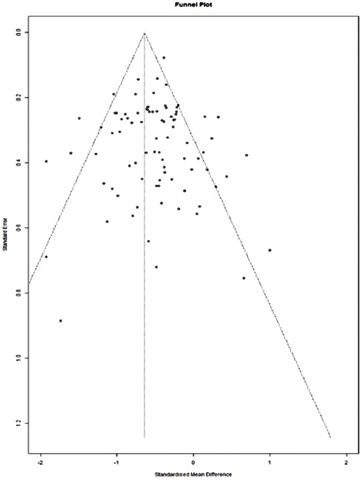 | 124 | −0.64 | [−0.89; −0.40] | −5.16 | <0.001 | 1.3097 [1.3720; 2.6909] | 88.3% [86.6%; 89.8%] | 1054.43 |