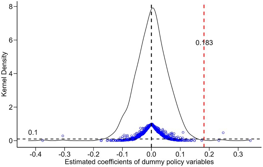 The second placebo test method illustrates the distribution of the estimated coefficients in Figure 2. The horizontal axis denotes the magnitude of the estimated coefficients for the ‘dummy policy variables,’ while the vertical axis indicates the density value and the p-value. The curves represent the kernel density distribution of the estimated coefficients, the blue dots signify the corresponding p-values, and the red vertical dotted line indicates the p-value. This paper’s benchmark regression cohort DID model yielded a real estimate of 0.183; the black horizontal dotted line denotes the significance level of 0.1. The figure clearly illustrates that the majority of the estimated coefficient values cluster around 0, with corresponding p-values exceeding 0.1, indicating that most of the estimated coefficients derived from randomly altering the values of the degree of enrollment expansion at the 10 percent level are not statistically significant. Conversely, the actual estimated coefficients derived from the benchmark regression of this study significantly diverge from the majority of the regression outcomes, suggesting that the estimation findings are not coincidental, hence validating the results of the placebo test.