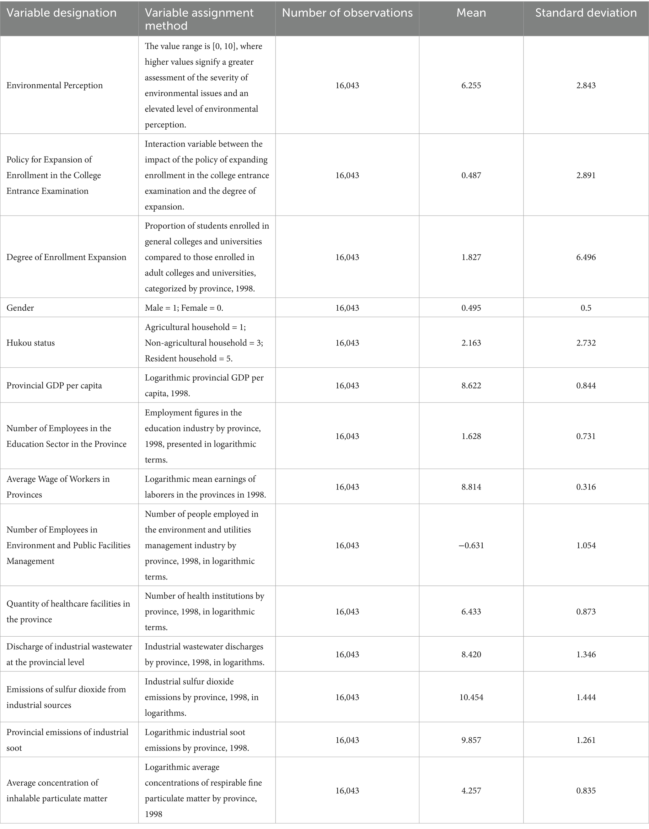 Lü and Zhang (2019) developed indicators to assess the extent of enrollment expansion by examining the number of students enrolled in local colleges and universities. These indicators not only fulfill this requirement but also take into account the significance of adult higher education as a crucial component of China’s higher education system, thereby incorporating the enrollment figures from adult higher education institutions into their analysis. The enrollment of students in adult higher education institutions is a significant aspect of China’s higher education system, reflecting the extent to which expansion policies have altered the distribution of opportunities among various student demographics, about environmental influences. Regarding control variables, Xi represents individual characteristics, encompassing gender and hukou status; Xp denotes provincial characteristics from 1998, including economic status and various factors influencing individual environmental perception, primarily per capita GDP, employment in the education sector, average worker wages, employment in environmental and public facilities management, and the number of health institutions. Additionally, it includes industrial wastewater emissions, industrial sulfur dioxide emissions, industrial soot emissions, and average concentration of inhalable particulate matter. These control variables interact with Cohortc to allow the impact of the birth cohort to vary according to specified provincial characteristics, thereby capturing the influence of provincial attributes. γc represents Individual Birth Cohort Fixed Effects; πp is Province Fixed Effects; and εipc is a random perturbation term.
