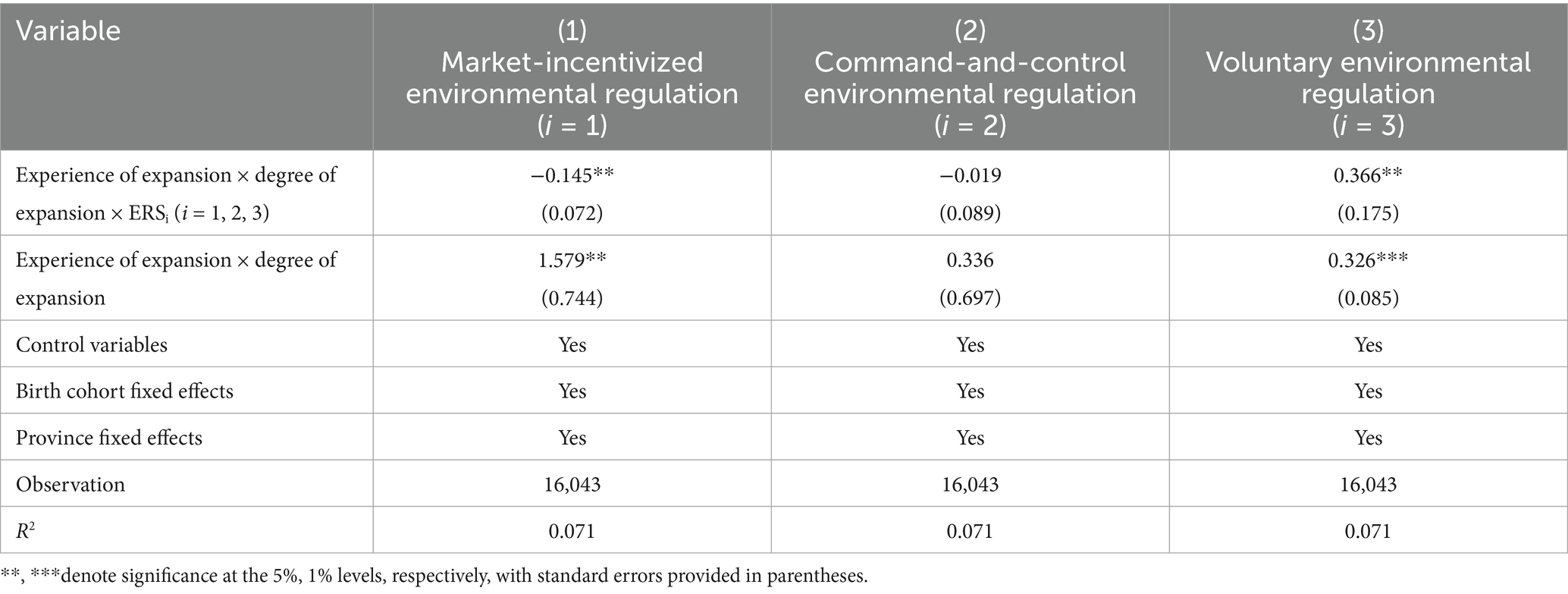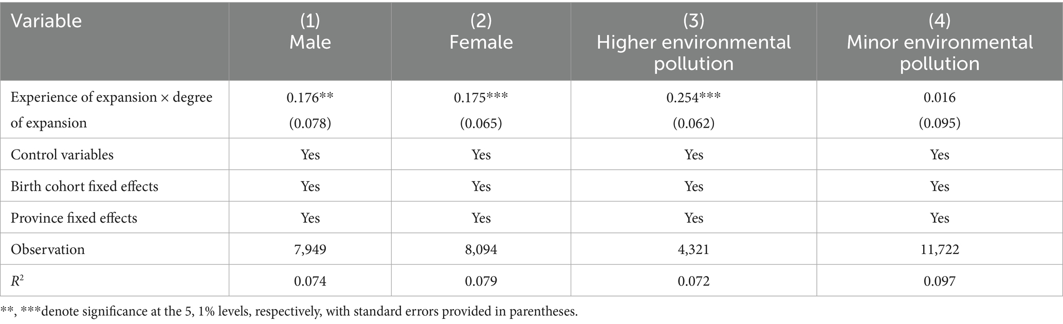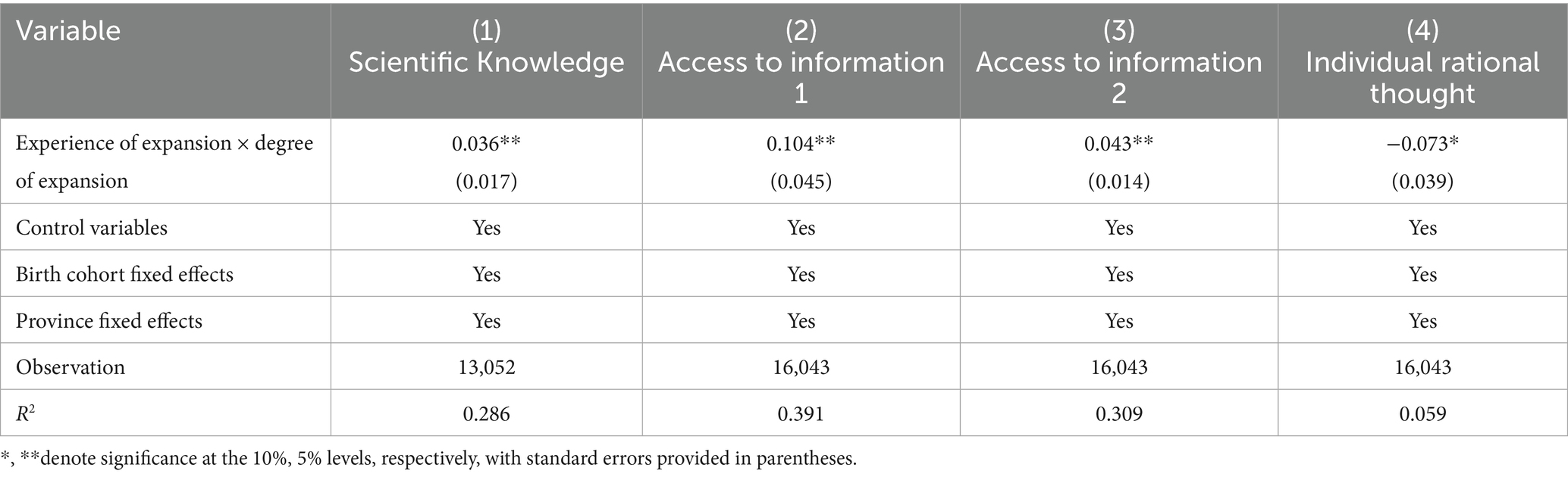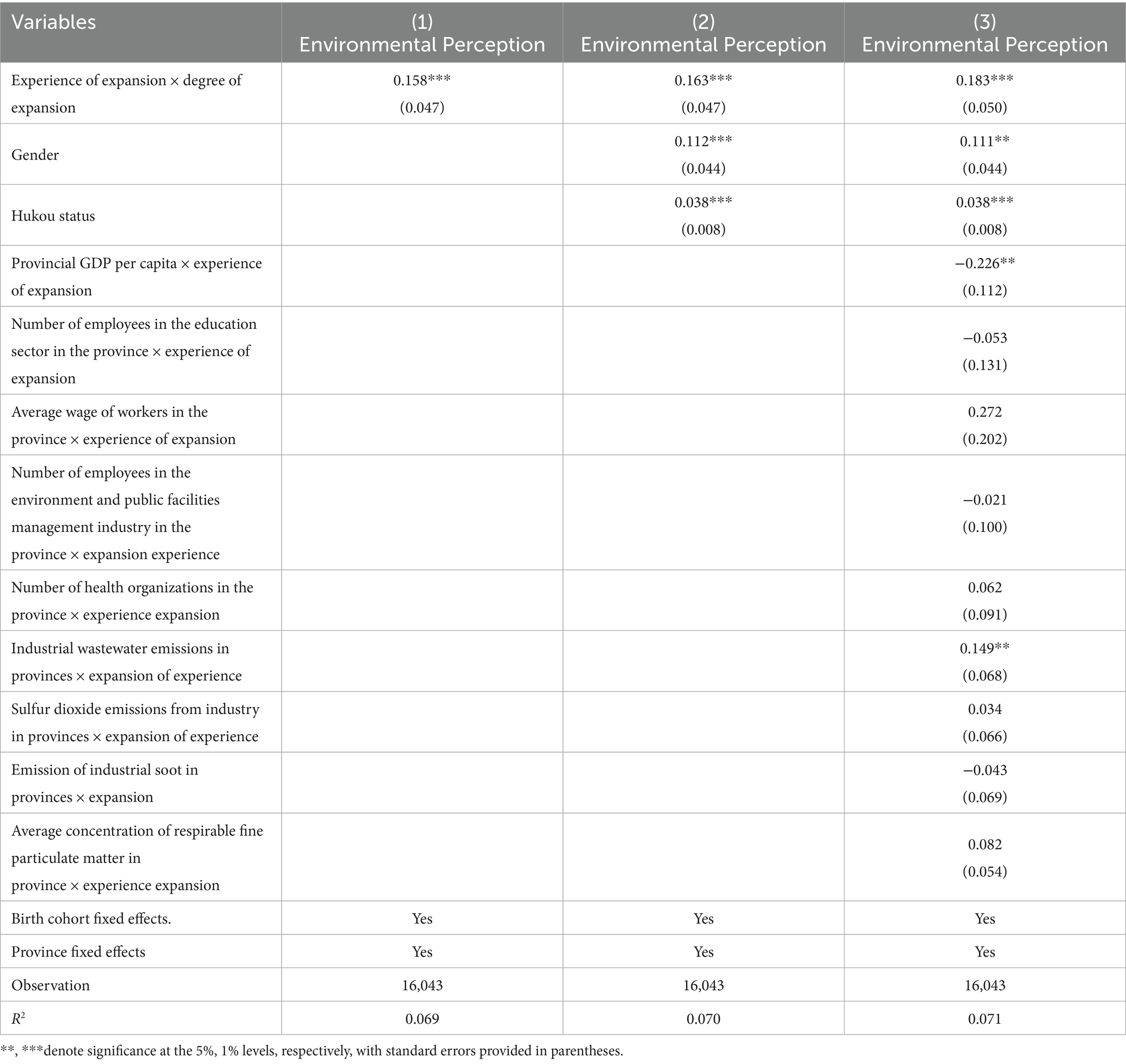 This study examines the substantial impact of higher education on public environmental perceptions through benchmark regression, focusing on the implications of the college entrance examination’s expansion at the educational level. Firstly, higher education directly augments the public’s years of schooling; numerous education policies in China fundamentally enhance social equity within the educational sphere. The implementation of free education policies diminishes tuition fees for compulsory education students, thereby facilitating an increase in the enrollment rate of rural children (Xiao et al., 2017). Furthermore, the expansion of higher education fosters the advancement of overall educational equalization of opportunities (Bernardi and Ballarino, 2012). Secondly, the pedagogical model and educational philosophy of higher education facilitate the enhancement of individuals’ proficiency in utilizing instruments for information access, potentially aiding the public in acquiring greater environmental knowledge and subsequently refining their environmental awareness.