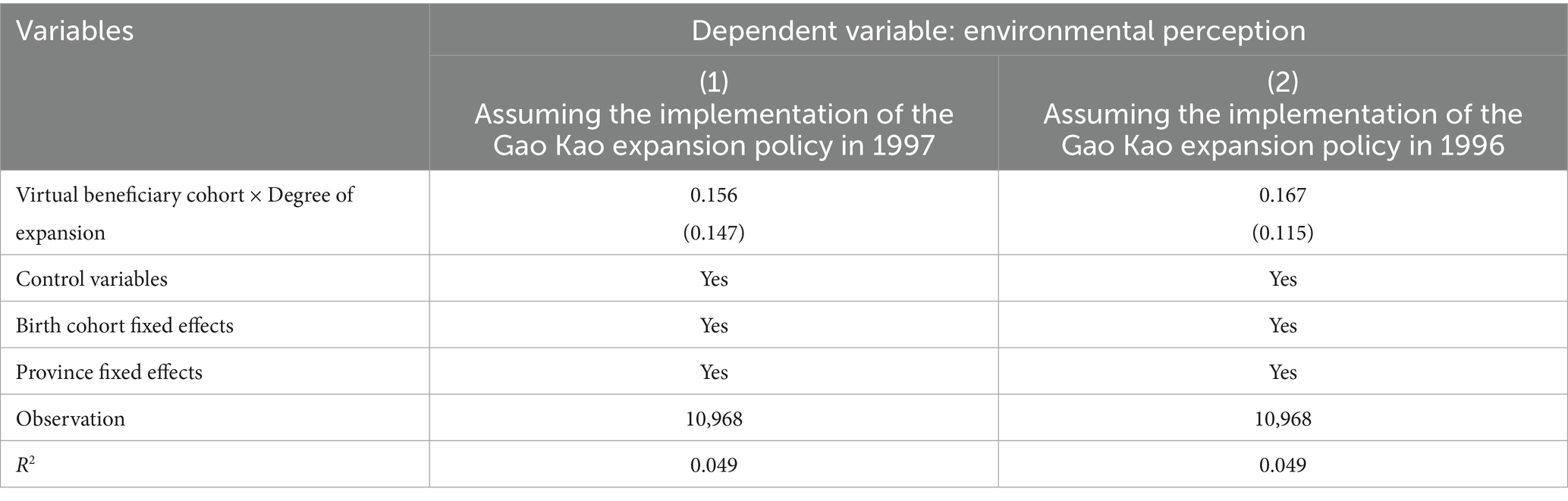 Initially, imagine that the college entrance examination expansion policy was enacted in 1997. The impacted birth cohort is 1979–1980, specifically persons aged 17–18 in 1997, and this segment of the dummy beneficiary cohort variable is designated a value of 1. Consequently, persons born in 1978 and earlier constitute the unaffected birth cohort, and this segment of the dummy beneficiary cohort variable is assigned a value of 0. Secondly, assuming the college entrance examination policy expansion was enacted in 1996, the impacted birth cohort comprises individuals aged 16–18 born between 1978 and 1980, designated with a value of 1 for the dummy beneficiary cohort variable. Conversely, individuals born in 1977 or earlier belong to the unaffected birth cohort, receiving a value of 0 for the same variable. In a manner akin to the benchmark regression, this analysis posits that the gaokao expansion policy was enacted in 1997 and 1996, respectively. The study interacts the dummy beneficiary cohort variable with the degree of expansion variable to derive the pseudo gaokao expansion policy variable, thereby capturing the policy effect. The regression results are displayed in Columns (1) and (2) of Table 3, with Column (1) illustrating the outcomes of the regression assuming a policy implementation 2 years earlier, in 1997, and Column (2) detailing the results for a three-year earlier implementation, in 1996. The results show that the hypothetical 1997 and hypothetical 1996 high school expansion policies do not have a significant effect on the public’s perception of the environment.