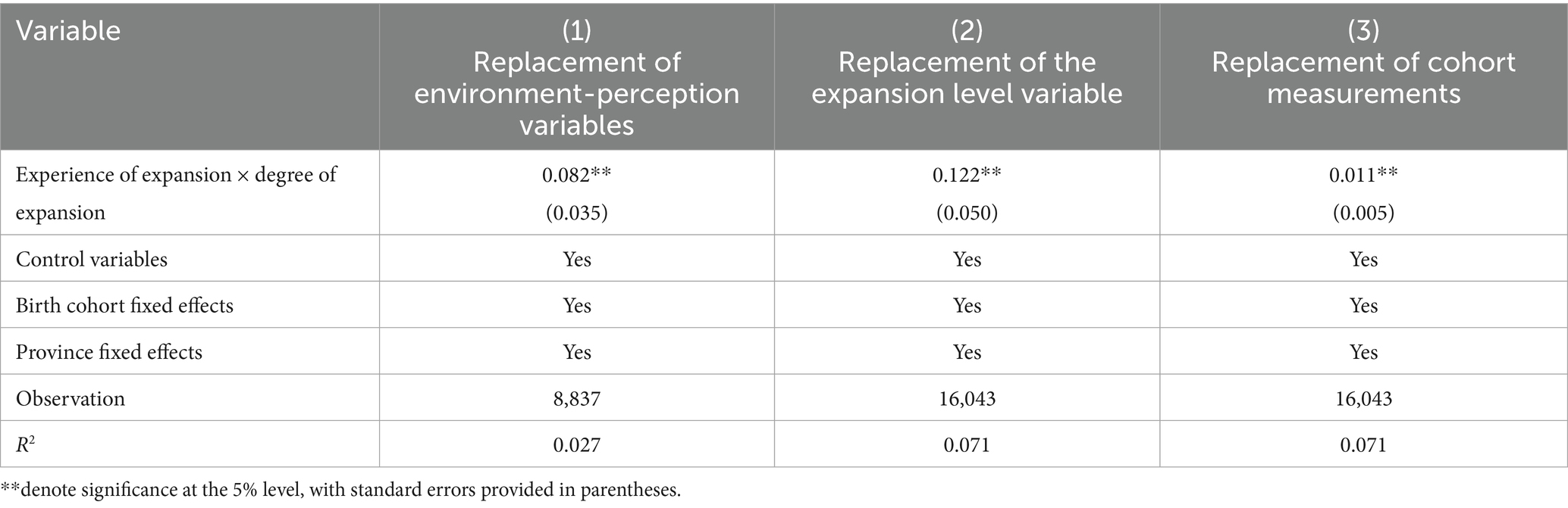 Secondly, this work reconstructs the variables that assess the higher education growth policy. Certain scholars utilize the ratio of students enrolled in local colleges and universities to those in general high schools within each province in 1998 to assess the extent of expansion in their examination of the effects of higher education expansion on family downsizing. Consequently, this paper substitutes the expansion degree variable in the benchmark regression with the variable from the cohort difference-in-difference analysis, and the regression outcomes are presented in Table 4 (2). Column (2) of Table 4 indicates that the results align with those of the benchmark regression, confirming that higher education positively influences public perception of the environment.