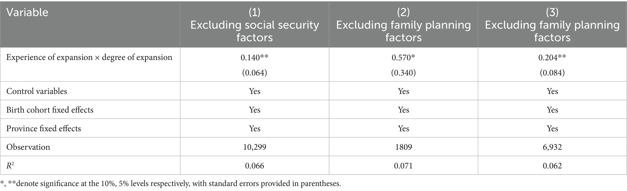 A further potentially disruptive policy is the family planning initiative that commenced in 1980, when the Central Committee of the Communist Party of China (CPC) released the ‘Open Letter to All Members of the Communist Party and the Communist Youth League on Controlling China’s Population Growth’ in September 1980, and the ‘one-child-only’ policy was initially proposed at the Third Session of the Fifth National People’s Congress (NPC) in the same year, leading to the extensive implementation of the ‘one-child-only’ policy. Consequently, it may be determined that the ‘one-child policy’ was initially implemented on a significant scale in 1980. Individuals born before September 1981 constituted the primary participants in the 1999 college entrance examination. Given that the expansion of the college entrance examination targeted the entire school-age demographic, it is challenging to entirely isolate the population influenced by the family planning policy but not by the expansion of the college entrance examination from the sample. To eliminate the impact of the family planning policy, this paper emulates the methodologies of existing scholars and employs two approaches to assess the interference policy: firstly, it selects a sample of ethnic minorities for regression estimation, as the ‘one-child’ rule does not apply to these groups, thereby mitigating the influence of the family planning policy. Secondly, samples from Henan, Hebei, Guangxi, Gansu, Inner Mongolia, Yunnan, Qinghai, Ningxia, Hainan, and Xinjiang were chosen for regression estimation, as these regions implemented the ‘two or more children’ birth policy during the initial phase of the family planning policy, thereby eliminating the potential interference of the family planning policy. Columns (2) and (3) of Table 5 demonstrate that the findings of this article remain resilient despite the omission of family planning policies.