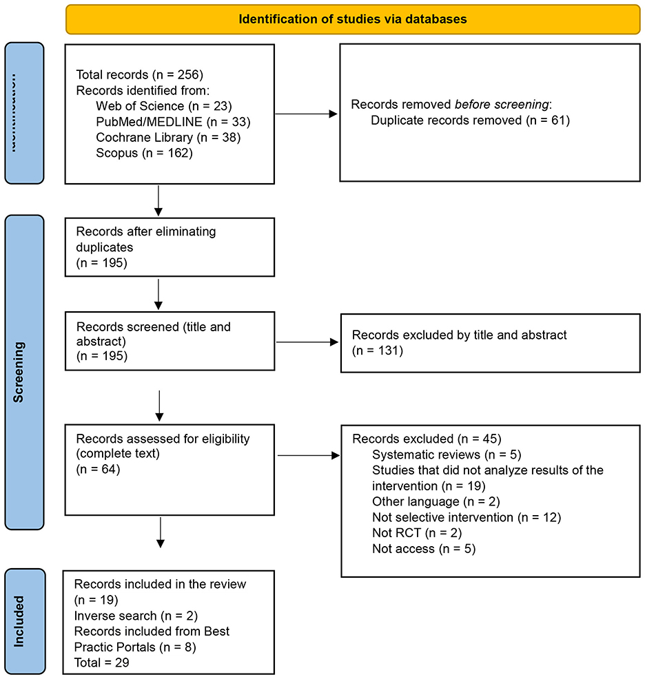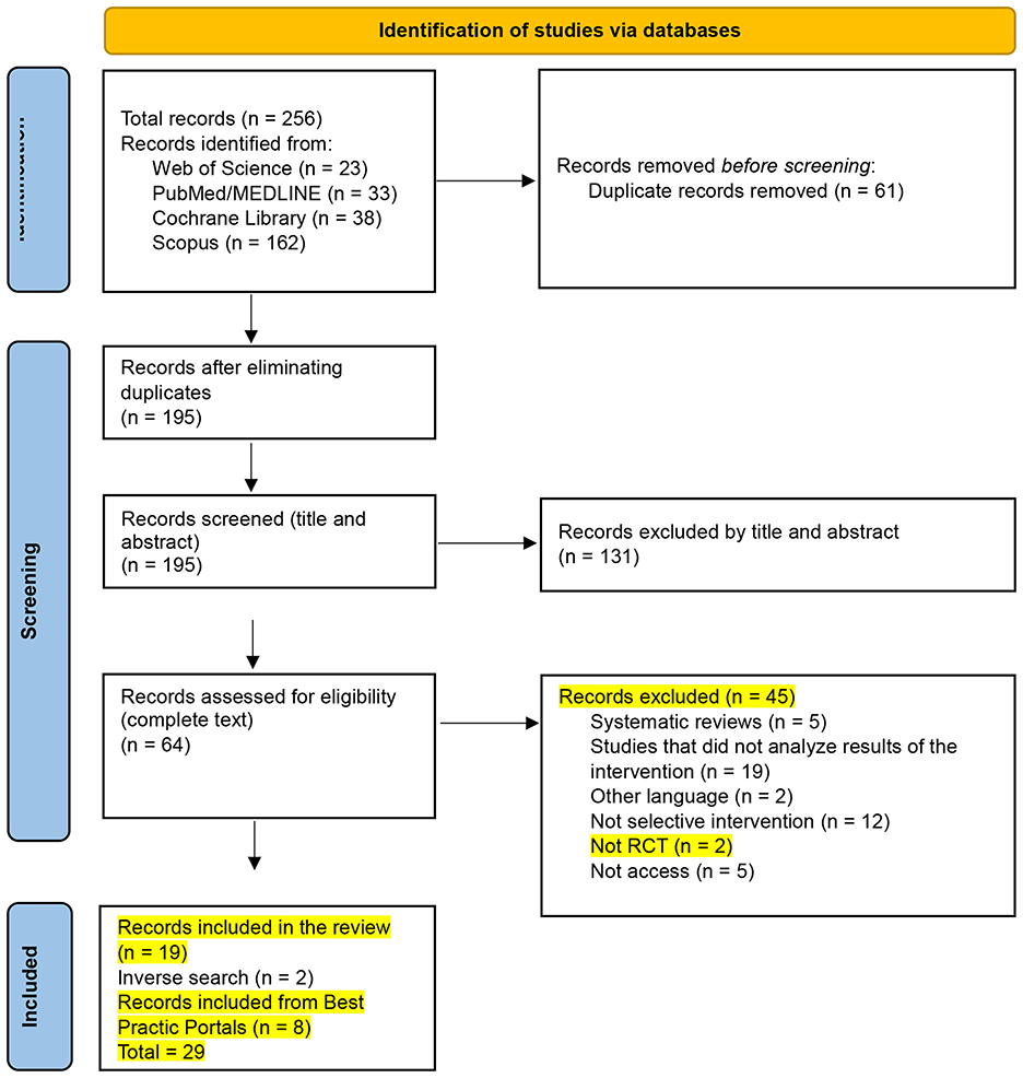 Regarding best practice repositories, 4 programs were identified in Xchange, of which 3 were supported by randomized controlled trials (RCTs). Since some of these studies had already been retrieved from the database search, 8 additional studies were reviewed. In the Spanish Portal de Buenas Prácticas, one program was found, although it was not supported by any published study. In the Socidrogalcohol repository, 9 programs were identified, none of which had evidence from RCTs. The same applied to EDDRA, where 2 programs were located without such evidence.