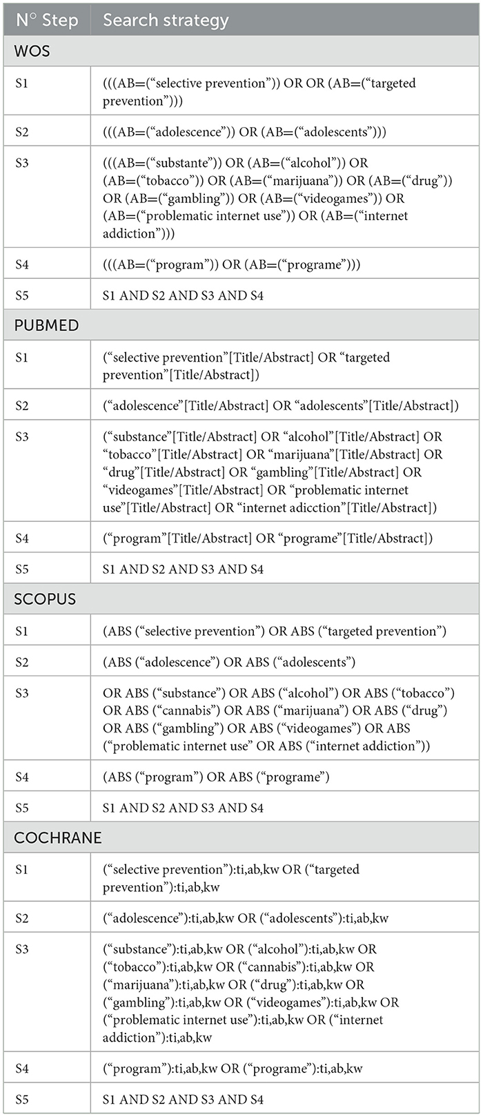 The search strategy (Table 1) included the keywords: “selective prevention,” “adolescence,” “substance,” “videogames,” “gambling,” “problematic internet use,” “program,” and their synonyms. These terms were combined into the following search string: (“selective prevention” OR “targeted prevention”) AND (“adolescence” OR “adolescents”) AND (“substance” OR “alcohol” OR “tobacco” OR “cannabis” OR “marijuana” OR “drug” OR “gambling” OR “videogames” OR “problematic internet use” OR “internet addiction”) AND (“program” OR “programe”).