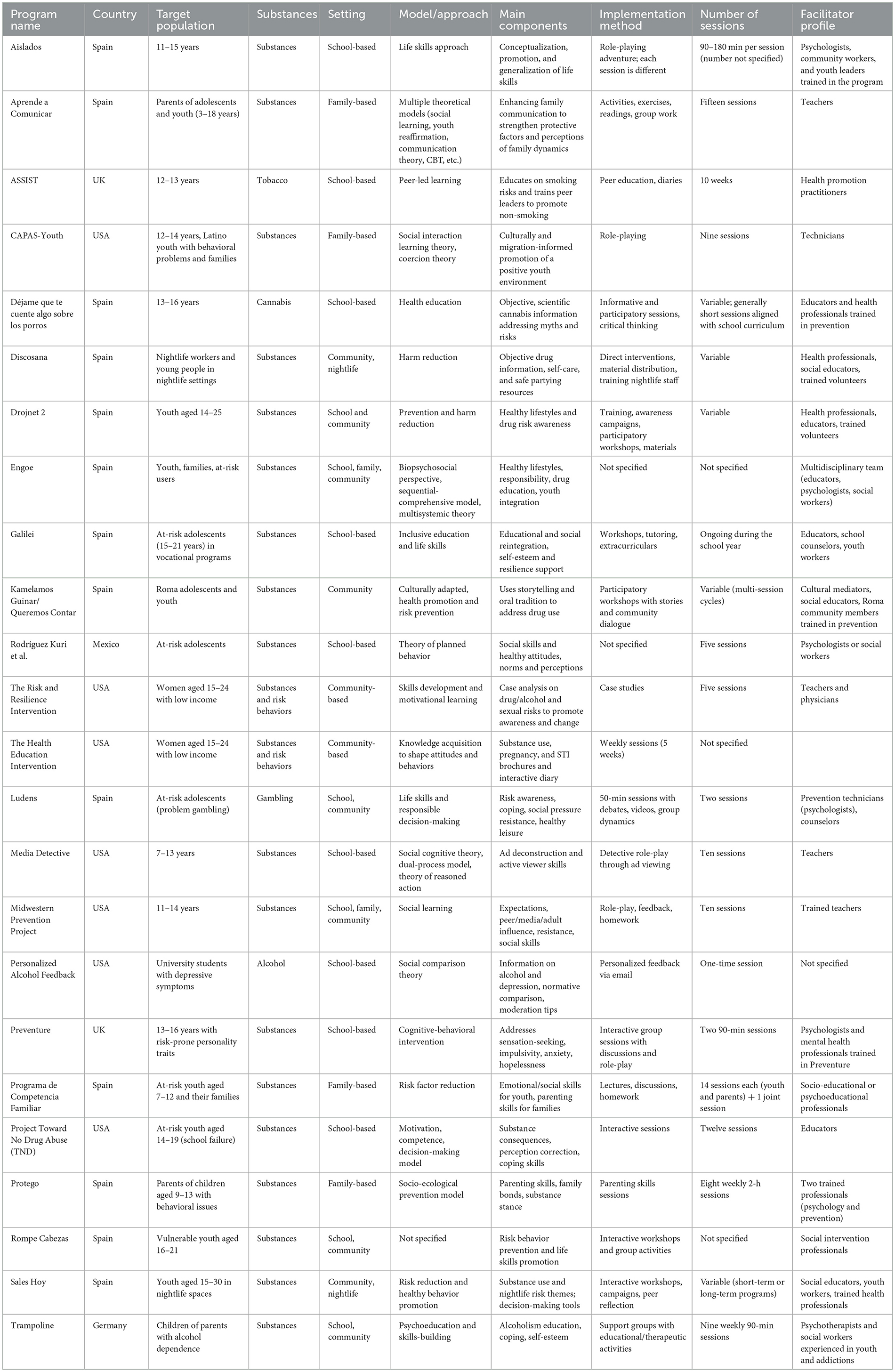 Results: A total of 20 studies were included, analyzing 24 programs, of which only a portion showed robust evidence according to criteria adapted from the GRADE system. Preventure, Trampoline, ASSIST, and Project TND stood out for their theoretical foundations, methodological quality, and sustained positive outcomes. Nevertheless, significant limitations were identified: heterogeneity in study designs, limited evaluation in Southern European contexts, and a lack of gender perspective and cultural adaptation.